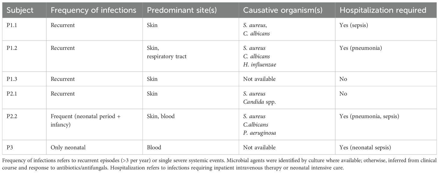 Patients from Family 1 and 2 demonstrated a high burden of recurrent cutaneous infections (Table 2). In Family 1, both P1.1 and P1.2 developed severe, recurrent bacterial and fungal skin infections, beginning after the age of three, primarily caused by Staphylococcus aureus and Candida albicans. These episodes frequently necessitated hospitalization and intravenous antibiotic therapy. Both patients were also diagnosed with severe, treatment-resistant asthma, requiring ongoing management with high-dose inhaled corticosteroids and bronchodilators at the last follow-up time. Notably, P1.2 had experienced two episodes of pneumonia, both requiring hospitalization and intravenous antibiotic therapy. In contrast, their younger sibling, P1.3, experienced only occasional, mild skin infections, which were successfully managed in the outpatient setting, and had no history of asthma or other allergic diseases.