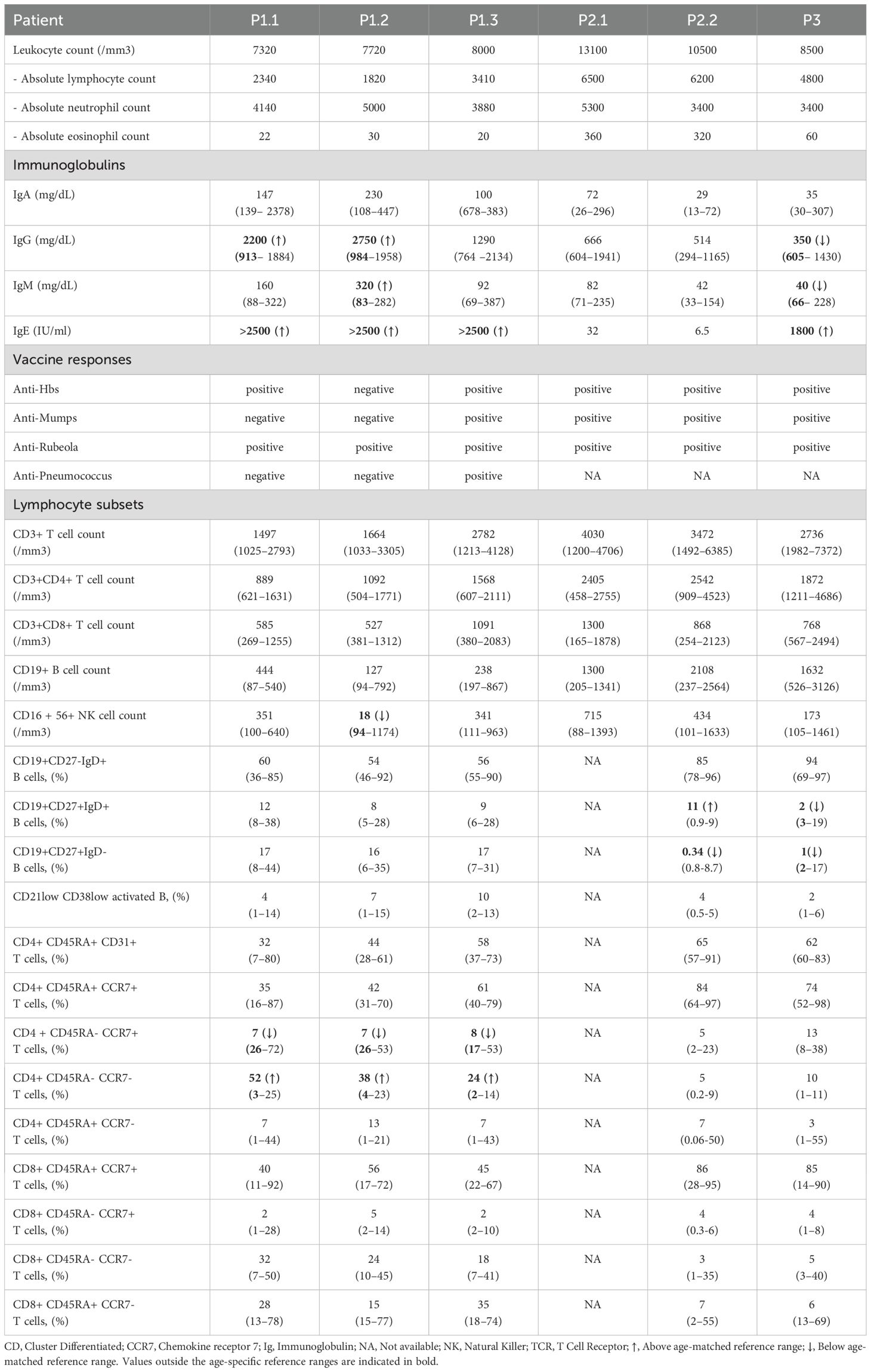 In Family 2, both siblings (P2.1 and P2.2) had normal serum IgE and immunoglobulin levels, with no evidence of antibody deficiency or systemic immune dysfunction. Vaccine-specific antibody titers were largely protective in both. Despite P2.2’s history of recurrent severe infections and multi-organ involvement, immunological evaluation revealed only subtle abnormalities, including an increased proportion of non-switched memory B cells and decreased switched memory B cells, while overall humoral and cellular immunity remained within normal limits. Although her IgG levels were below age-appropriate reference ranges during the first year of life, she mounted adequate vaccine responses, and her IgG levels normalized over time.
