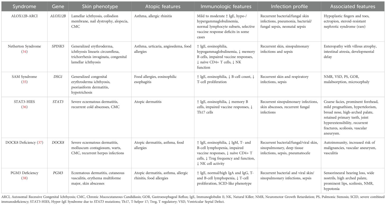 While ALOX12B-ARCI shares surface phenotypic features with syndromic ichthyoses, such as Netherton syndrome or STAT3 HIES, its immunological footprint appears milder, incomplete, and most consistent with secondary immune dysregulation. This emphasizes the importance of integrated dermatologic-immunologic evaluation in these patients, as summarized in Table 4.