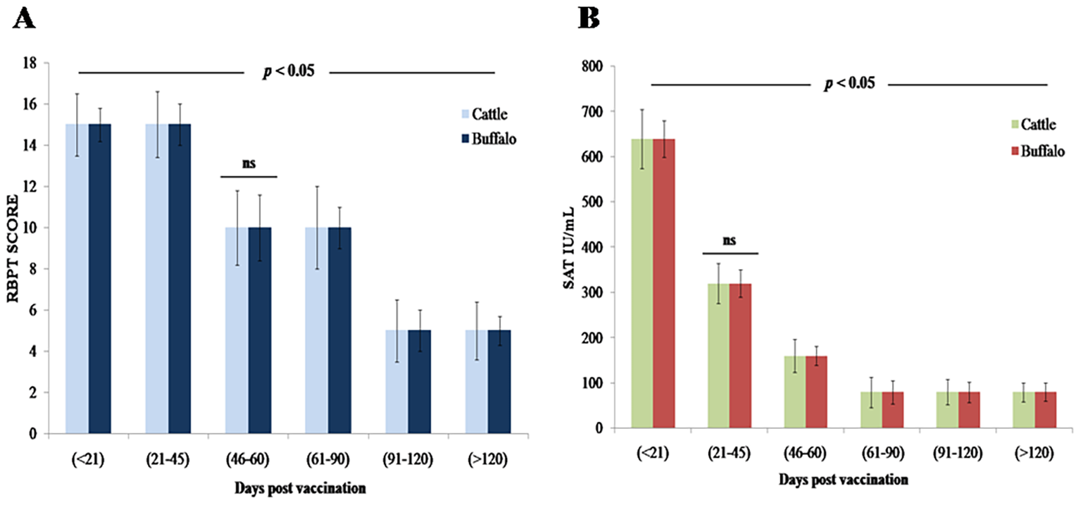 A statistically significant increase in antibody levels was observed by RBPT following vaccination with B. abortus S19 at 4 × 109 CFU/dose, with strong agglutination noted between DPV < 21 and 21–45 in both species, followed by a gradual decline (p < 0.05). Detectable agglutination persisted through DPV > 120, indicating a sustained immunological response, though no agglutination was observed beyond this period (Figure 1A, Table 1). No statistically significant differences were observed between cattle and buffalo calves (ns, p > 0.05), suggesting similar immune responses to vaccination.