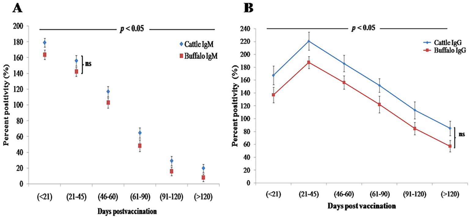 A total of 180 female calves (90 cattle and 90 buffalo calves) aged 4–8 months were equally distributed across six postvaccination intervals (15 animals/group/species for days postvaccination [DPV] intervals: DPV < 21, 21–45, 46–60, 61–90, 91–120, and > 120 days). All calves were confirmed seronegative for anti-Brucella antibodies by Rose Bengal Plate Test (RBPT) and indirect enzyme-linked immunosorbent assay (ELISA) prior to vaccination. Vaccinated animals were monitored for 3 weeks for adverse effects. Humoral immunity was assessed using RBPT and Serum Agglutination Test (SAT); antibody isotypes immunoglobulin M (IgM)/immunoglobulin G (IgG) were quantified by indirect ELISA, cytokines tumor necrosis factor-α (TNF-α), interleukin (IL)-6, IL-8, and IL-10 were measured by competitive inhibition ELISA, while IL-12, IL-1β, and interferon gamma (IFN-γ) were quantified using high-sensitivity sandwich ELISAs. All samples were processed by cold centrifugation (4°C) and stored at − 20°C until analysis.
