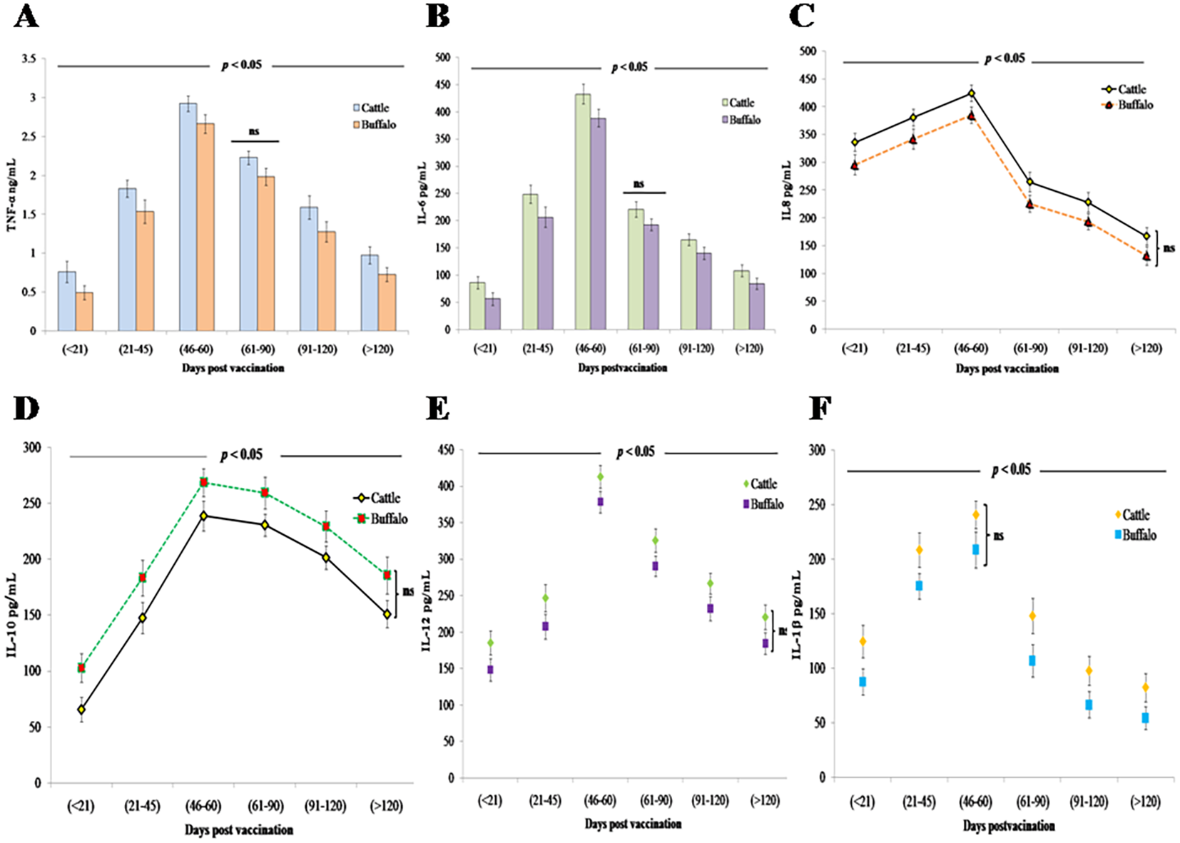 The concentrations of IL-12, a key Th1-polarizing cytokine, and IL-1β, an important proinflammatory mediator, exhibited significant temporal dynamics following vaccination. IL-12 responses peaked (p < 0.001) at DPV 46–60 in both cattle (412.7 pg/mL ± 15.3 pg/mL) and buffalo (378.4 pg/mL ± 14.8 pg/mL) (Figure 3E). Similarly, IL-1β concentrations in cattle reached their maximum levels (238.6 pg/mL ± 16.5 pg/mL; p < 0.001) during the same DPV interval (46–60) before subsequently declining. This coordinated peak of key immune mediators suggests a synchronized proinflammatory response following vaccination in cattle. However, a comparable vaccine-induced IL-1β response was not observed in buffalo calves (Figure 3F). Despite these trends, no statistically significant differences in cytokine levels were observed between cattle and buffalo at any specific time point (ns, p > 0.05), although significant variations were noted across different postvaccination intervals (p < 0.05), reflecting dynamic cytokine responses over time.
