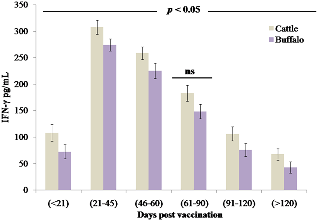 The study quantified IFN-γ, a key mediator of cell-mediated immunity and macrophage activation. Vaccination with B. abortus S19 induced a robust Th1-type immune response in both cattle and buffalo calves, demonstrated by significant IFN-γ production (p < 0.001) as early as DPV < 21 (cattle: 108.4 pg/mL ± 15.8 pg/mL; buffalo: 72.7 pg/mL ± 13.4 pg/mL). IFN-γ levels peaked at DPV 21–45 in both cattle (307.7 pg/mL ± 13.4 pg/mL) and buffalo (274.2 pg/mL ± 11.7 pg/mL), followed by a gradual but significant decline (p < 0.05 at each interval) (Figure 4). Analysis revealed that the 4 × 109 CFU/dose of B. abortus S19 induced a comparable magnitude and kinetics of IFN-γ response (p > 0.05) to conventional vaccine doses, confirming its efficacy in stimulating protective cell-mediated immunity. No statistically significant differences were observed between cattle and buffalo at any time point (ns, p > 0.05); however, significant variations across postvaccination intervals (p < 0.05) demonstrated dynamic patterns of immune activation over time.