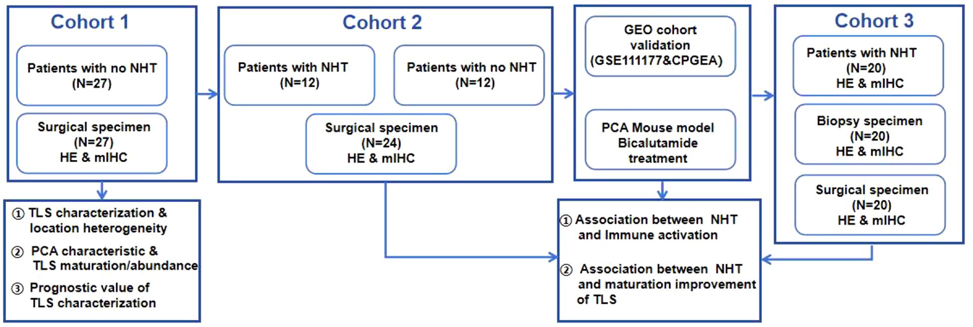 Despite the robust findings, our study has certain limitations. First, the sample size for some of the analyses, particularly in the matched pre- and post-NHT patient samples, was relatively small, which may limit the generalizability of the results. Future studies with larger cohorts are necessary to validate our findings. Second, patients in the NHT group exhibited statistically higher Gleason scores than No-NHT group in cohort 2. This baseline imbalance may still introduce potential selection bias. Additionally, while we utilized both clinical samples and an orthotopic PCa mouse model, further research is needed to fully elucidate the molecular mechanisms by which NHT promotes TLS formation. Another area for future investigation is the interaction between TLSs and other immune-modulatory treatments, such as immune checkpoint inhibitors (ICIs). Given that TLS presence is associated with improved immune responses, combining NHT with ICIs could provide a synergistic effect, potentially enhancing treatment outcomes in patients with advanced PCa. Studies exploring this combination could pave the way for new therapeutic strategies aimed at leveraging the benefits of TLSs.