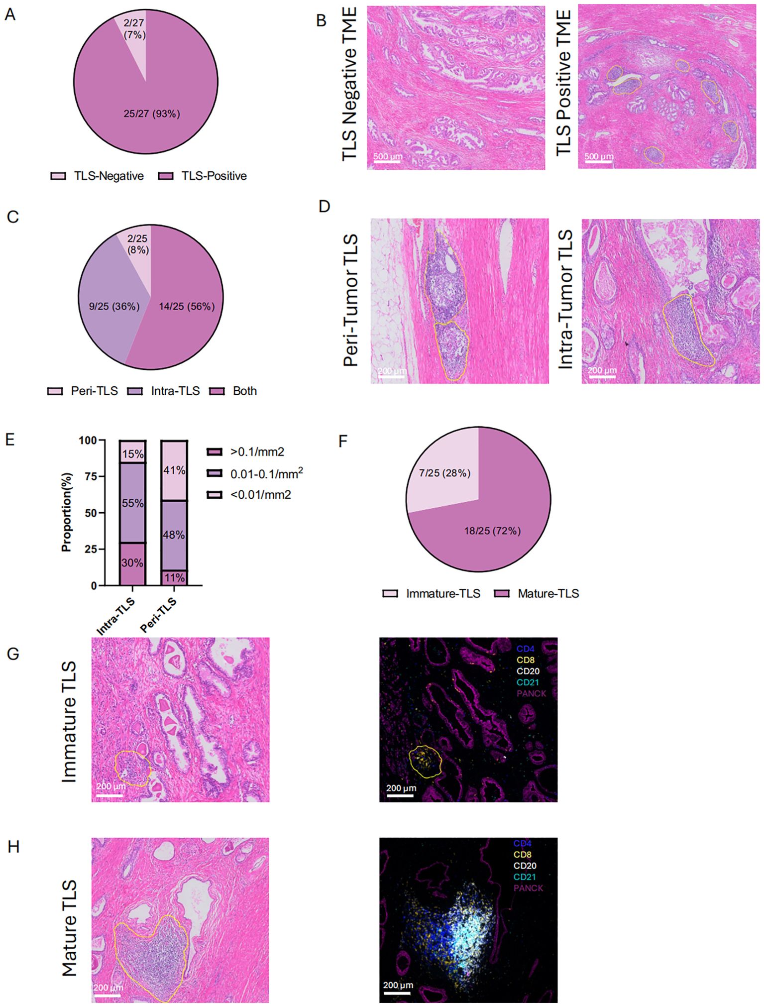 Figure 2. Location and maturation status of tertiary lymphoid structures (TLS) (A, B) Histological comparison of TLS-negative and TLS-positive in cohort 1. (C, D) Distribution and of histological representation of peri- and intra-tumoral TLS in cohort 1.(E) Density of TLS in peri- and intra-tumoral regions. (F) Proportion of immature and mature TLS in cohort 1. (G,H) HE and mIHC of immature and mature TLS. Peri- tumoral TLS: TLS which located at the leading edge of carcinoma with benign prostatic tissue at one end. Intra- tumoral TLS: TLSs which were surrounded on all sides by tumor. Immature TLS: specific aggregations of lymphocytes. Mature TLS: germinal center B cells localize in the central area, with CD4+ and CD8+ T lymphocytes distributed in the peripheral regions. Statistical significance was determined by Wilcoxon rank-sum test (B-E).