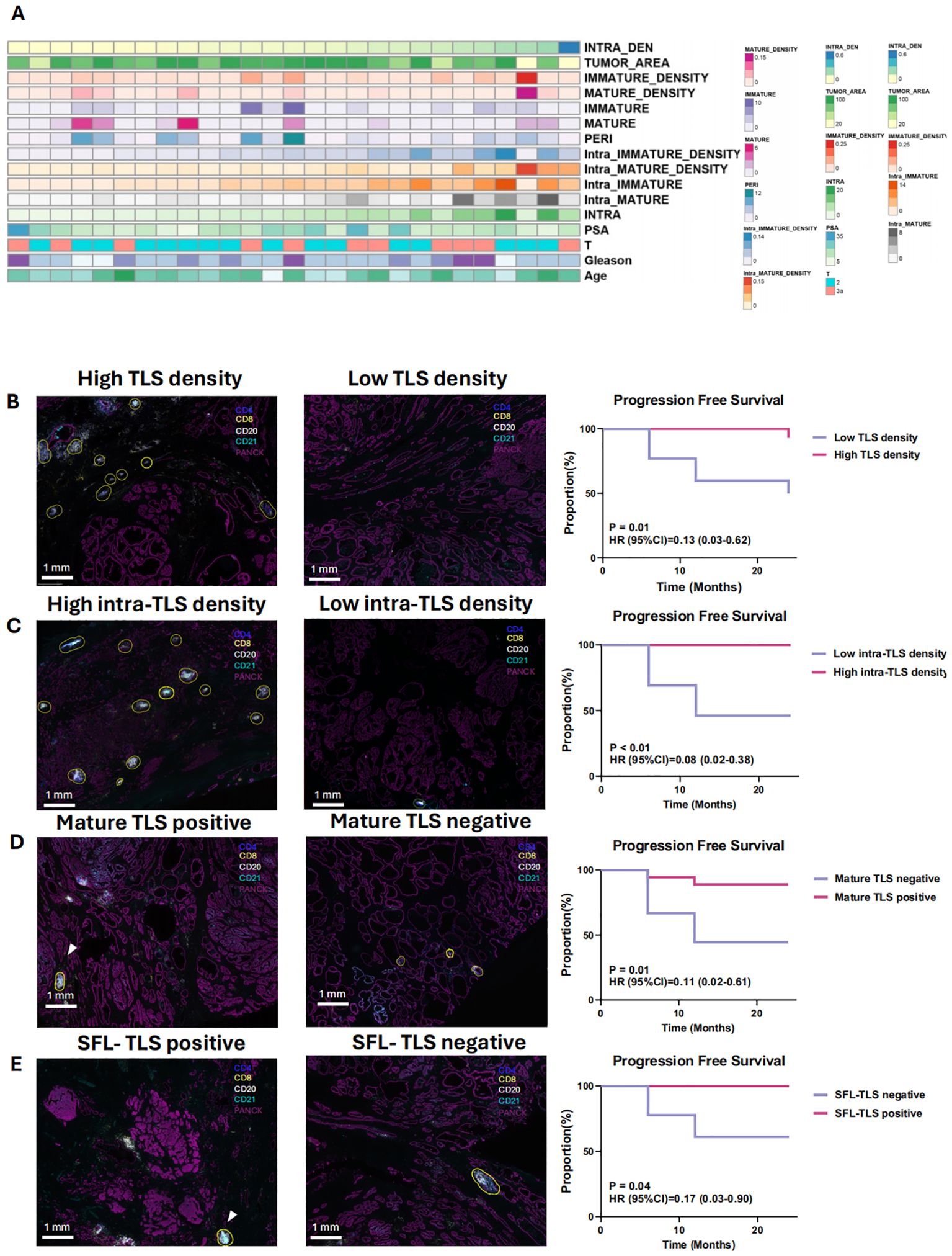 Figure 3. Clinicopathological features and prognostic significance of tertiary lymphoid structures (TLS) (A) The distribution of clinical features and immature density for the 27 patients in cohort 1. (B) Kaplan-Meier survival curves for progression-free survival (PFS) of 27 patients with no treatment before surgery stratified based on the median density of TLSs (B), density of intra-/peri- TLSs (C), maturation of TLSs (D) and the existence of SFL-TLSs (In SFL-TLS, CD21+ follicular dendritic cells form dense clusters within the core germinal center) (E). B–E: Differentiate Kaplan-Meier curves with distinct colors for better visual clarity. 3D & 3E: Clarify the difference between “mature TLS” and “SFL-TLS.”.