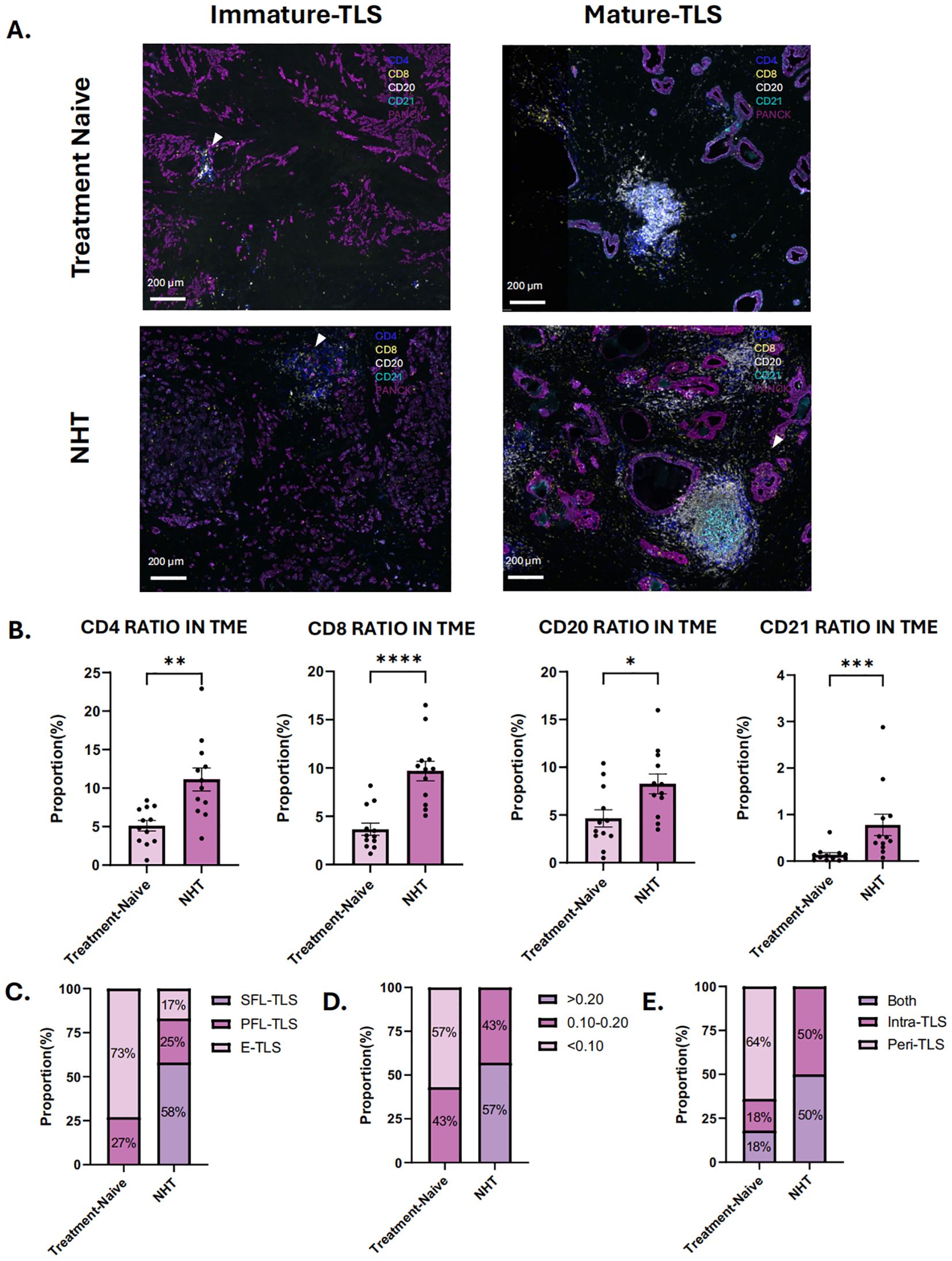 Figure 4. Characteristics of tertiary lymphoid structures (TLS) in treatment-naive group and neoadjuvant hormone therapy (NHT) group in cohort 2. (A) mIHC of immature and mature TLS in NHT group and treatment-naive group in cohort 2; (B) Comparison of the ratio of CD4 + cells, CD8+ cells, CD20+cells and CD21+cells in tumor microenvironment (TME) in the NHT group and treatment-naive group. (C) Proportion of different TLSs maturation stage in the NHT group and treatment-naive group. (D) Proportion of different density of TLS in the NHT group and treatment-naive group. (E) Proportion of different location of TLS in the NHT group and treatment-naive group. P values are denoted as follows: *p < 0.05, **p < 0.01, ***p < 0.001, ***p < 0.0001.