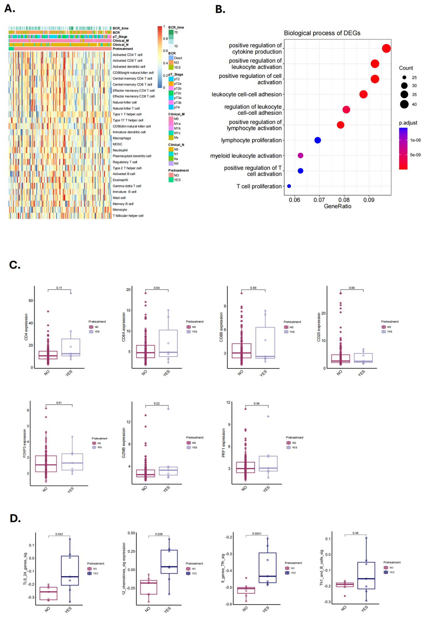 Figure 5. Characteristics and changes of immune cells in with/without neoadjuvant hormone therapy (NHT) groups in CPGEA cohorts. (A) Supervised clustering of PCa specimens by NHT (n = 7 with NHT and n = 127 without NHT), displaying ssGSEA scores (CPGEA cohorts). (B) The biological process of DEGs identified in with/without NHT groups (CPGEA). (C) Comparison of the expression of CD4, CD8A and CD8B, CD20, FOXP3, GZMB, PRF1 in PCa patients with/without NHT using CPGEA cohort (n = 120). (D) Comparison of GSVA scores utilizing four TLS signatures in with/without NHT samples from CPGEA cohort.