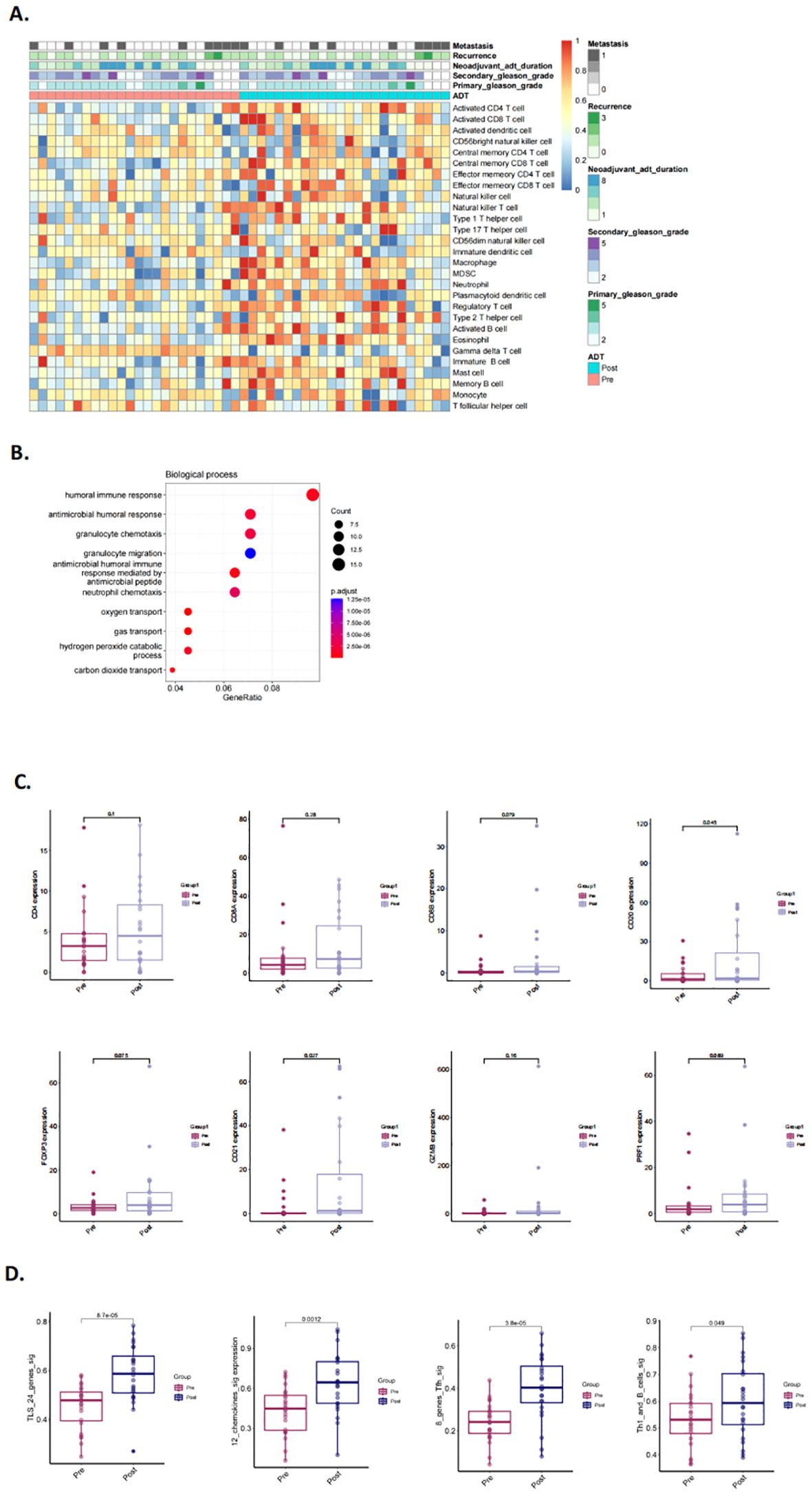 Figure 6. Characteristics and changes of immune cells in pre- and post- neoadjuvant hormone therapy (NHT) groups in GSE111177. (A) Supervised clustering of PCa specimens by NHT (n = 24), displaying ssGSEA scores (GSE111177). (B) The biological process of DEGs identified in pre-/post- NHT groups (GSE111177). (C) Comparison of the expression of CD4, CD8A and CD8B, CD20, FOXP3, CD21, GZMB, PRF1 in PCa patients before and after NHT using GSE111177 cohort (n = 24). (D) Comparison of GSVA scores utilizing four TLS signatures in 24 paired pre-NHT and post-NHT samples from GSE111177.