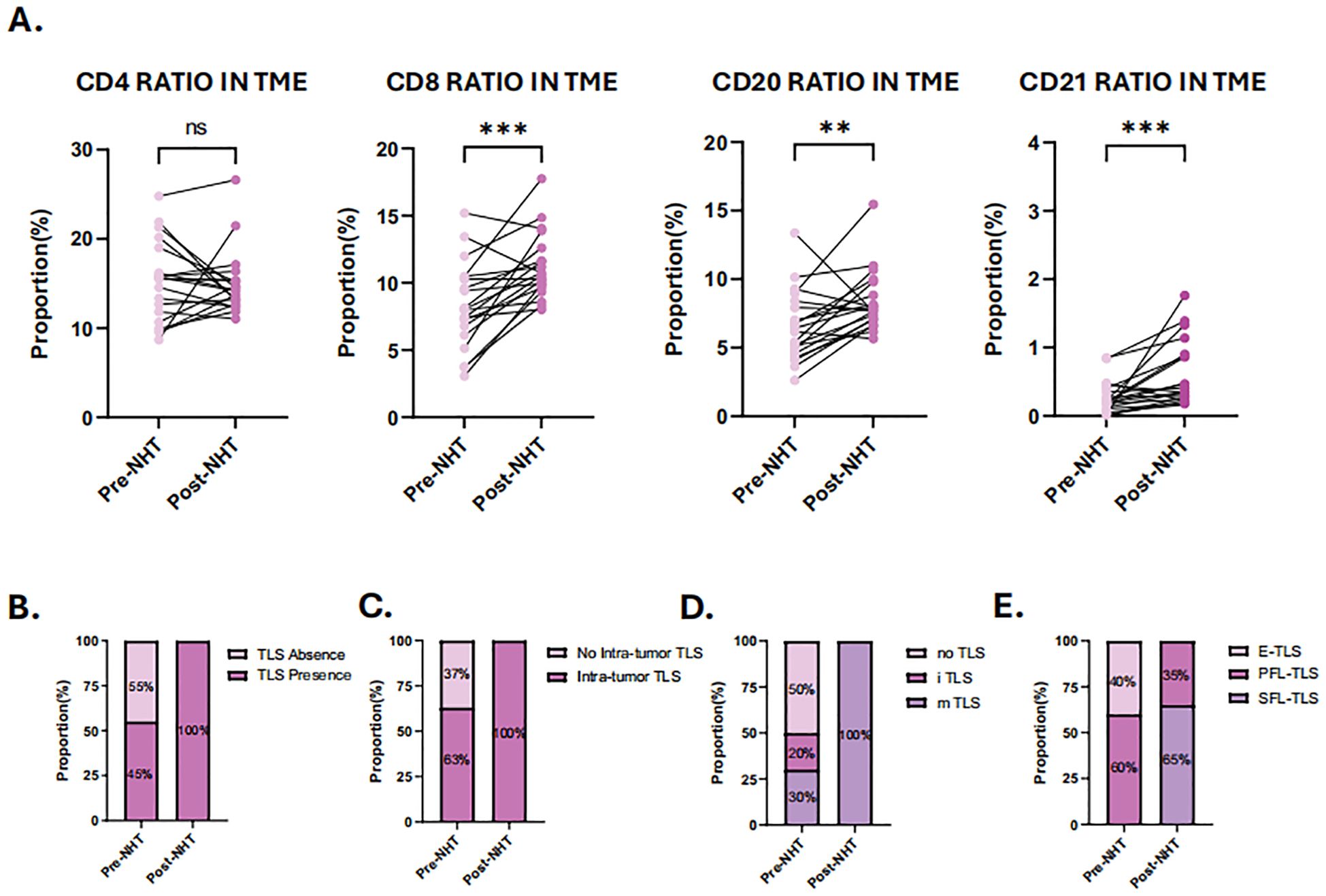 Figure 7. Characterization of tumor immune microenvironment (TME) and tertiary lymphoid structures (TLS) before and after neoadjuvant hormone therapy (NHT). (A) Comparison of the ratio of CD4 + cells, CD8+ cells, CD20+cells and CD21+cells in TME before and after NHT. (B) Comparison of the TLS presence in TME before and after NHT. (C) Comparison of the intra-tumor TLS presence in TME before and after NHT. (D) Comparison of the TLS maturation stage in TME before and after NHT. (E) Evaluation of TLS maturation stage using mIHC staining of CD4, CD8 CD20, CD21 before and after NHT. P values are denoted as follows: **p < 0.01, ***p < 0.001, NS p>0.05.