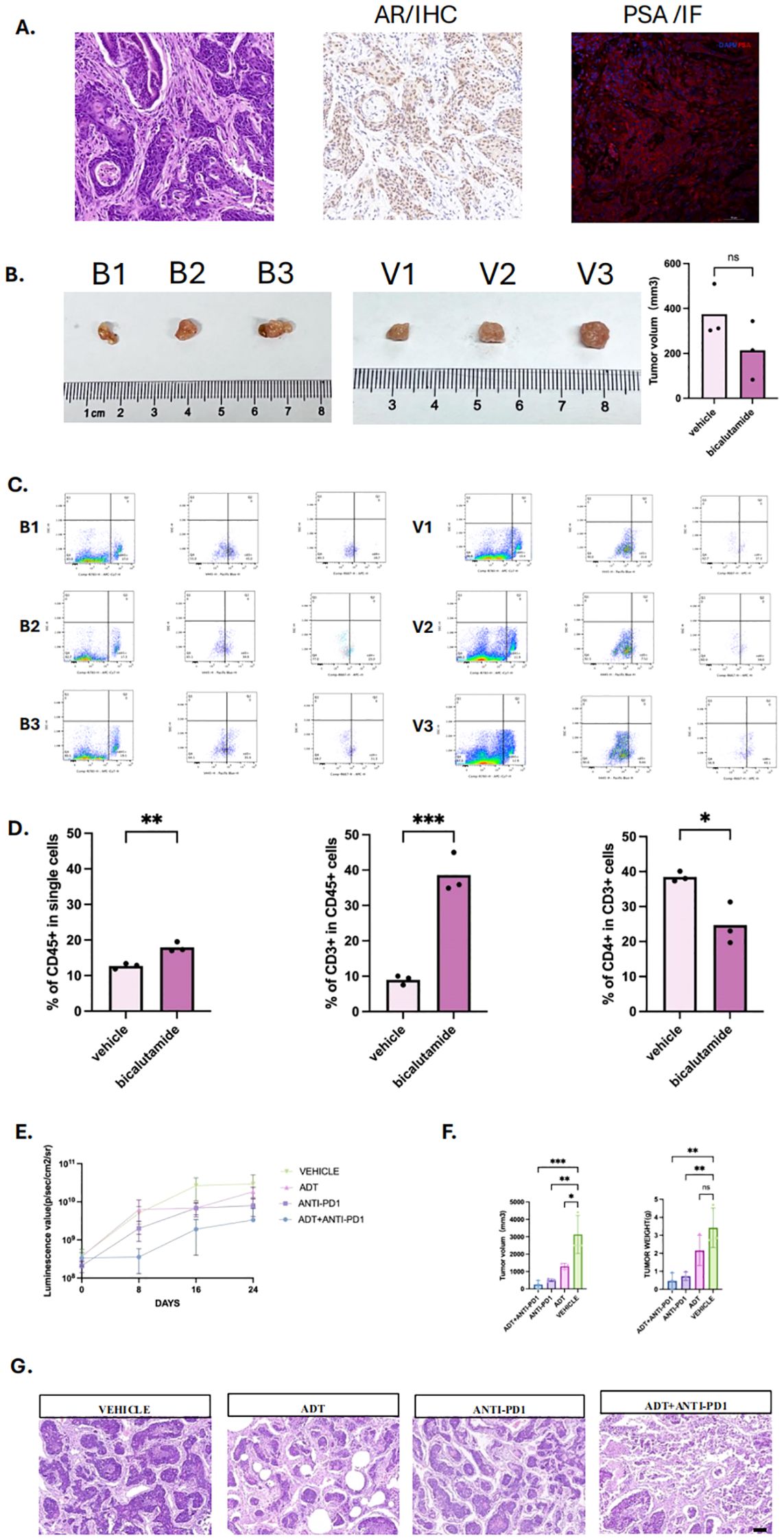 We then treated the mice with bicalutamide. The results showed no significant difference of the mean tumor volume between the bicalutamide-treated group (213.58 mm³) and the control group (374.71 mm³) (Figure 8B, P>0.05). However, flow cytometry of the single cells digested from the tumor tissue revealed a higher proportion of CD45+ immune cells in the bicalutamide group compared to the control group (18% vs 12.73%). Additionally, CD45+CD3+ T cells were more abundant in the bicalutamide group (39% vs 9%), while CD45+CD3+CD4+ T cells were fewer in the bicalutamide group (24.65% vs 39.47%) (Figures 8C, D). The specified gating strategy was shown in Supplementary Figure 3. This finding led us to hypothesize that combining immunotherapy with ADT could enhance the anti-tumor response. We divided the mice into four groups (n=3): the anti-PD1 group, the ADT group, the anti-PD1 combined with ADT group, and the vehicle group. Treatment began when the luminescence value of the orthotopic prostate tumor reached 108. The luminescence values during treatment indicated that the anti-PD1 combined with ADT group exhibited the most effective anti-tumor response (Figure 8E). Tumor volume measurements further confirmed the superiority of the combination therapy (Figure 8F). Notably, one mouse in the anti-PD1 combined with ADT group showed no detectable tumors after treatment, and their corresponding luminescence values were significantly lower than those of other groups. We further conducted HE staining for each group. Significant necrosis could be observed in the combination therapy group. All three treatment groups exhibited varying degrees of tumor regression (Figure 8G).