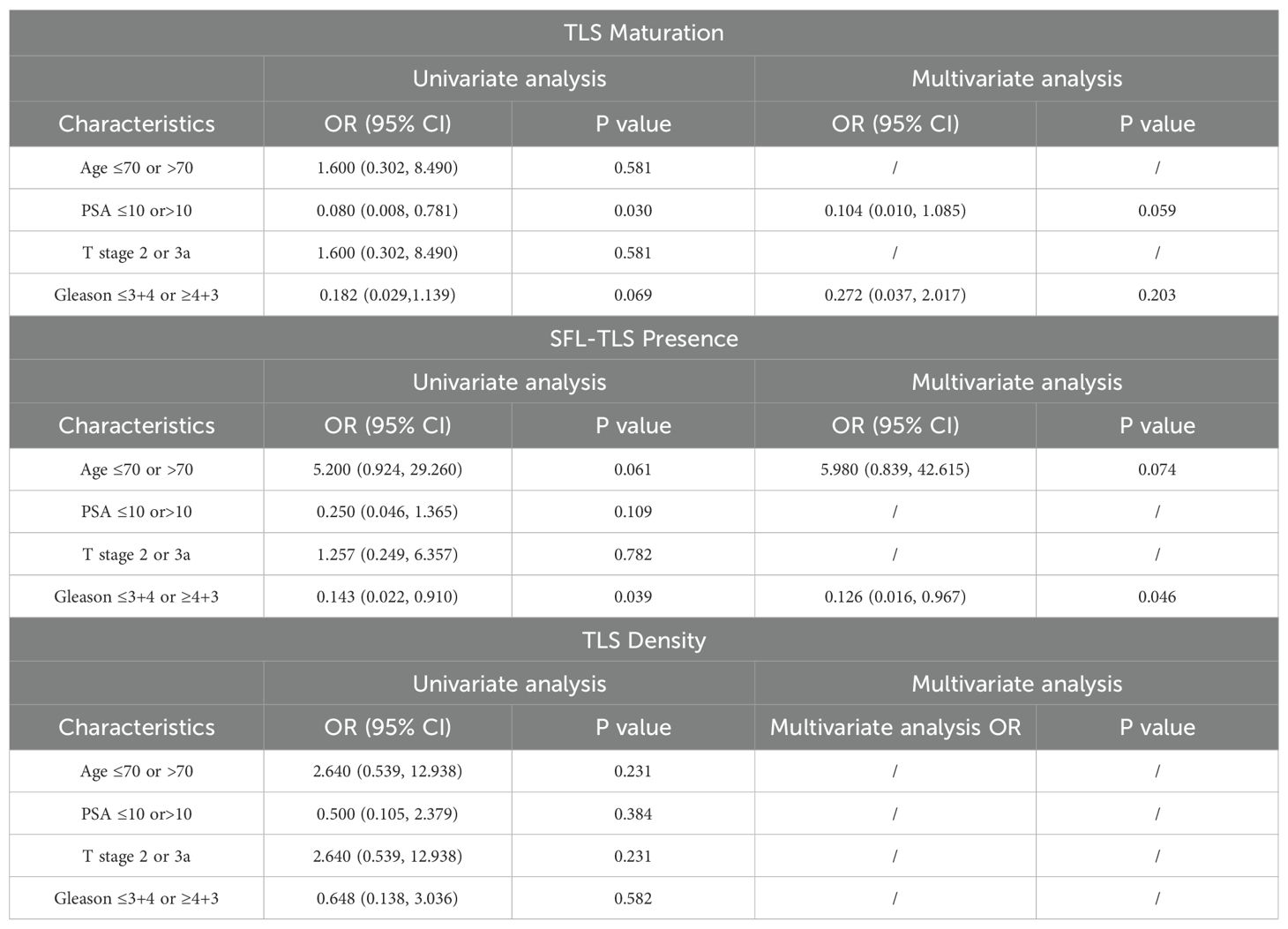 Prostate cancer (PCa) is a prevalent malignancy with rising global incidence and mortality (1, 2). First-line treatments, including prostatectomy and androgen deprivation therapy (ADT), are often effective initially, but many advanced cases progress to lethal metastatic castration-resistant prostate cancer (mCRPC) within an immunosuppressive tumor microenvironment (TME) (3–5). Immune checkpoint blockade (ICB) therapies, though effective in other cancers, show limited success in PCa, primarily due to its low lymphocyte infiltration, classifying it as a ‘cold tumor’ (6–8). Developing strategies to convert cold tumors into hot tumors is essential for enhancing antitumor immunity and achieving durable therapeutic responses. Studies have investigated how various factors and therapeutic interventions alter the immune microenvironment in prostate cancer. Dallos et al. demonstrated that ADT could transformed the immune phenotype into an inflamed environment in PCa, characterized by increasing activated CD8 T cells and proinflammatory M1 tumor-associated macrophages (9). However, the relationship between tertiary lymphoid structures (TLS), a critical immune marker, and prostate cancer remains largely unexplored.