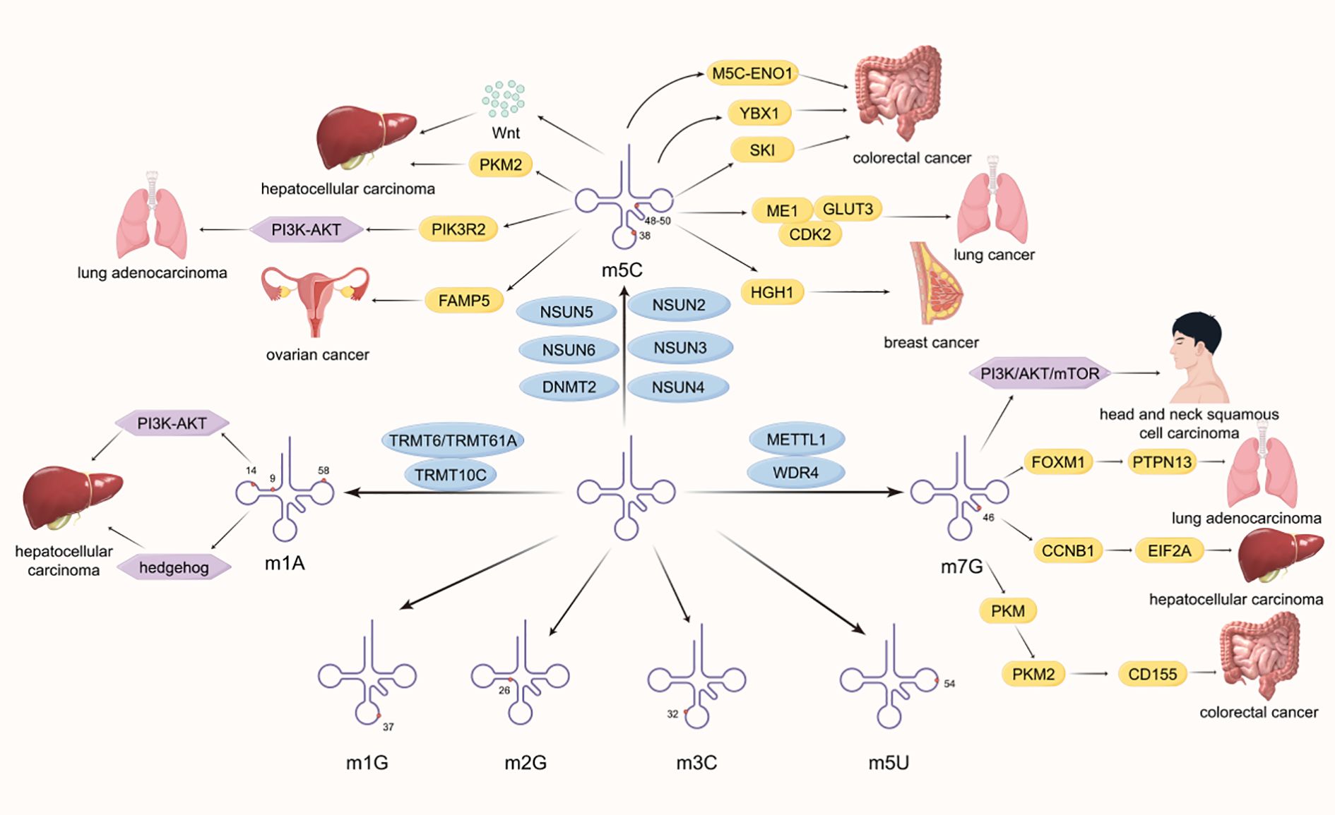 Figure 1. This demonstrates the distribution of different RNA methylation modifications in tRNA and the mechanism and principles of how some methyltransferases affect the development of malignant tumors. Common methylation sites include N1 methyladenosine (m1A), N3 methylcytosine (m3C), N5 methylcytosine (m5C), N1 methylguanosine (m1G), N2 methylguanosine (m2G), and N7 methylguanosine (m7G).