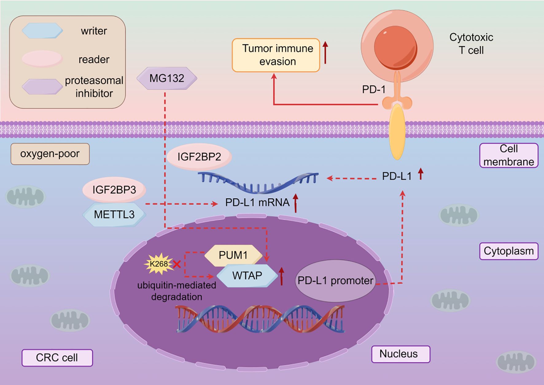 Figure 2. The mechanism of action of WTAP in cancer immunotherapy. In CRC, hypoxia can increase the expression of WTAP, and PUM1 can directly bind to WTAP to inhibit ubiquitin mediated degradation of WTAP under hypoxic conditions, thereby enhancing the expression of PD-L1 and the stability of IGF2BP2 and PD-L1 mRNA binding, inhibiting the anti-tumor activity of T cells, in other words, promoting cancer progression.