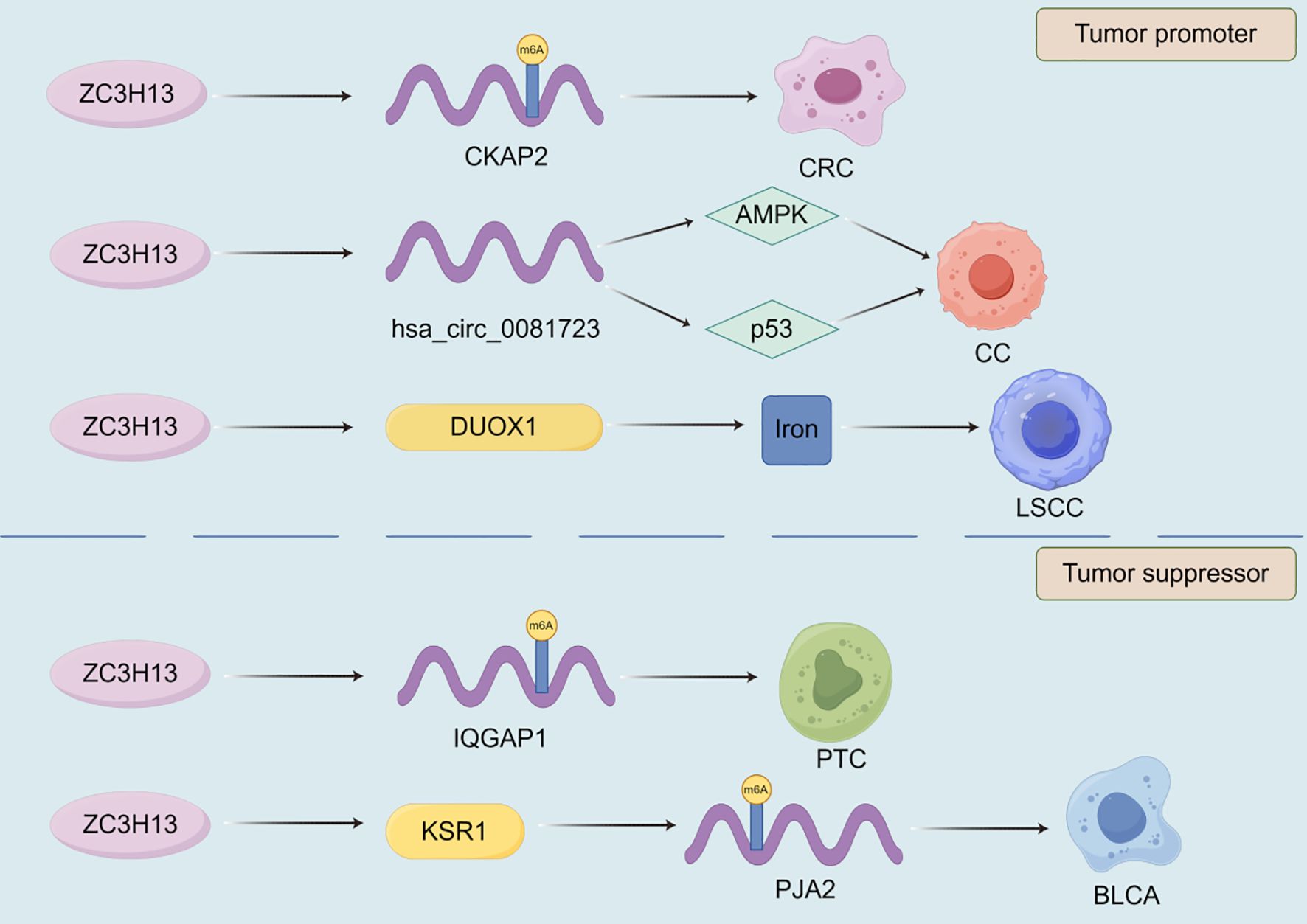 Figure 3. The role of ZC3H13 in the progression of malignant tumors. Among many mechanisms, ZC3H13 can promote or inhibit the progression of malignant tumors by affecting the targeted gene m6A modification.