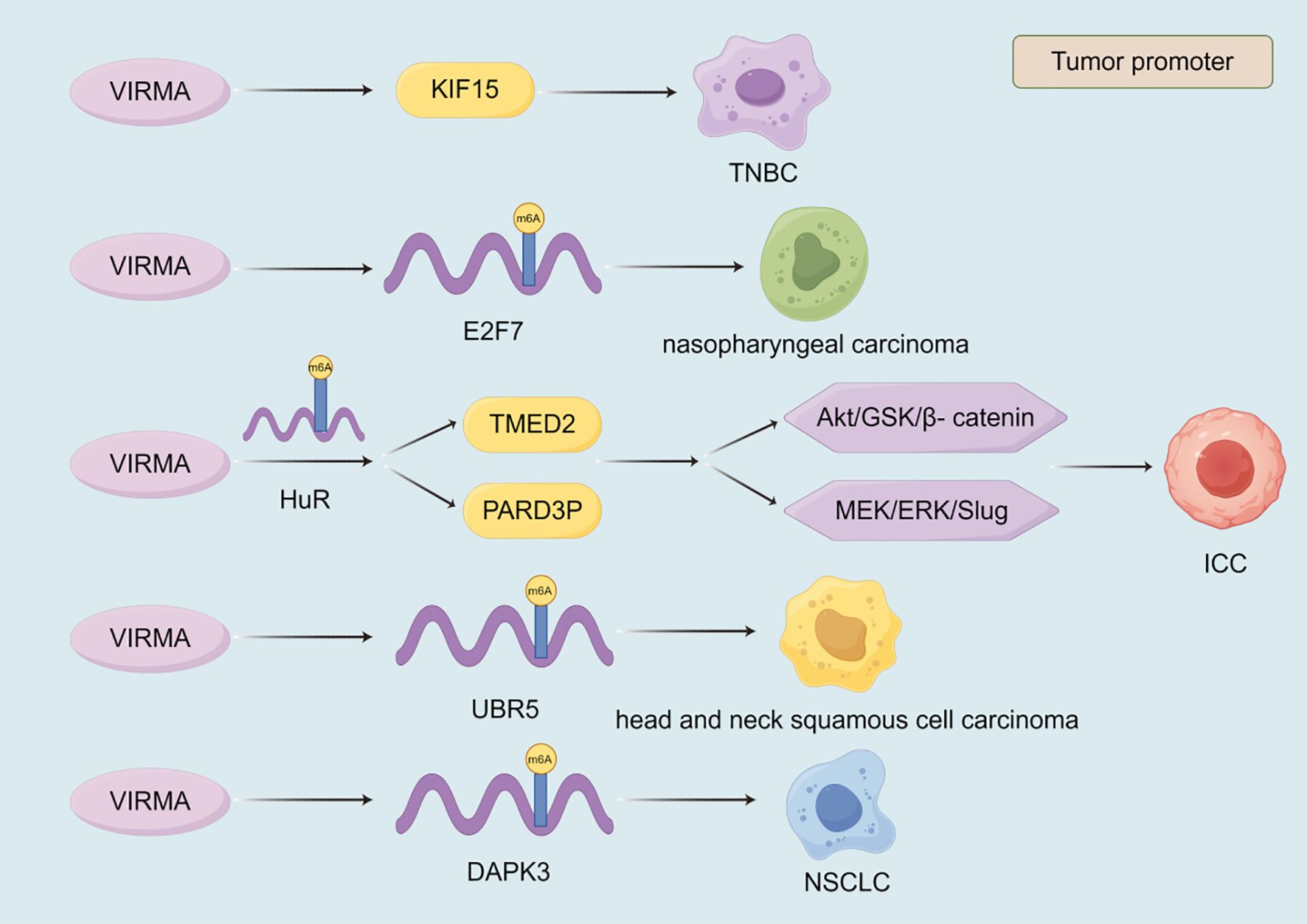 Figure 4. The role of VIRMA in the progression of malignant tumors. The currently discovered roles of VIRMA in malignant tumors are all promoting. VIRMA promotes the progression of malignant tumors by regulating the expression of target genes, the stability of their transcripts, and signaling pathways.
