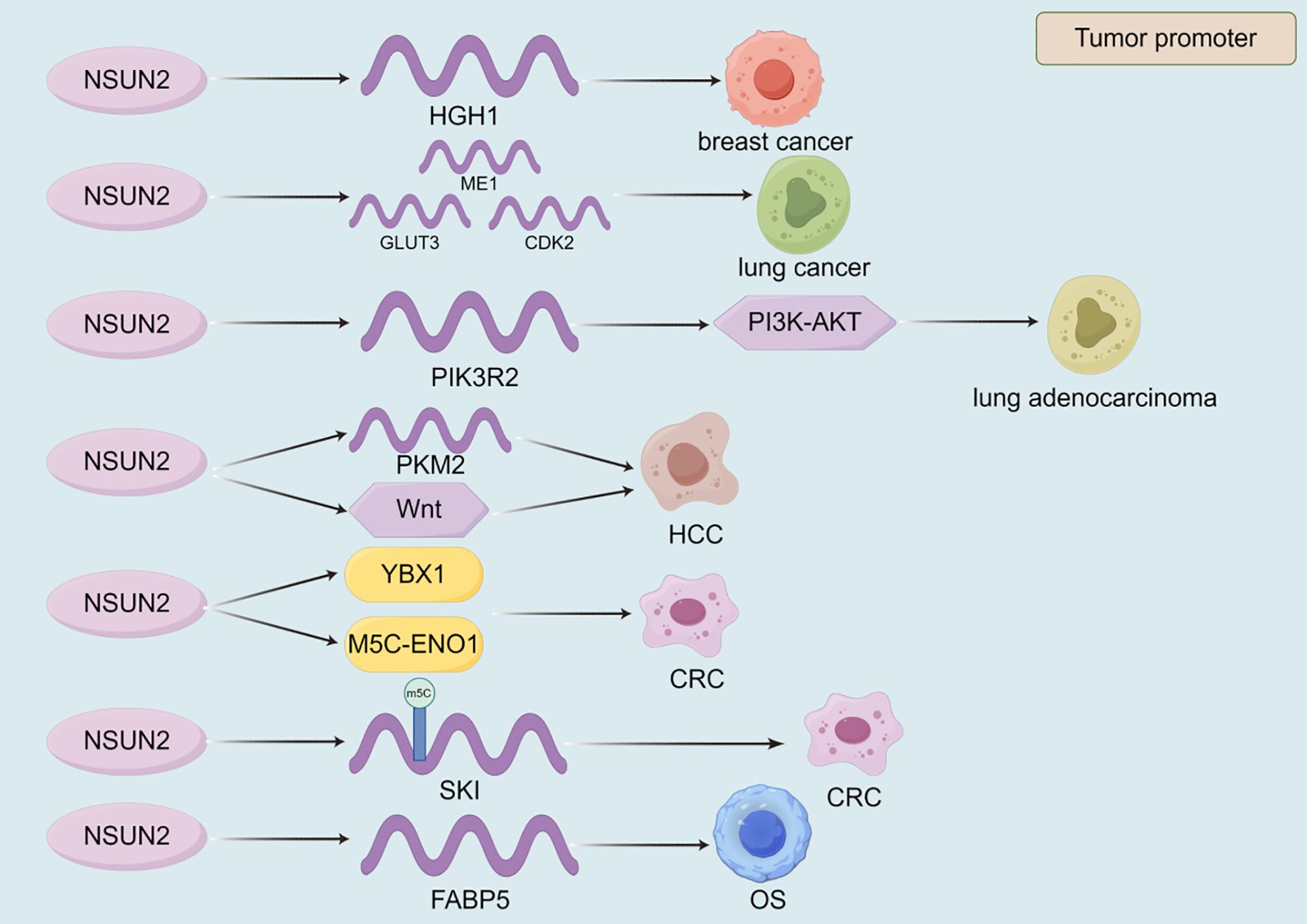Figure 5. The role of NSUN2 in the progression of malignant tumors. The currently discovered roles of NSUN2 in malignant tumors are all promoting. VIRMA promotes the progression of malignant tumors by regulating the expression of target genes, the stability of their transcripts, and signaling pathways.