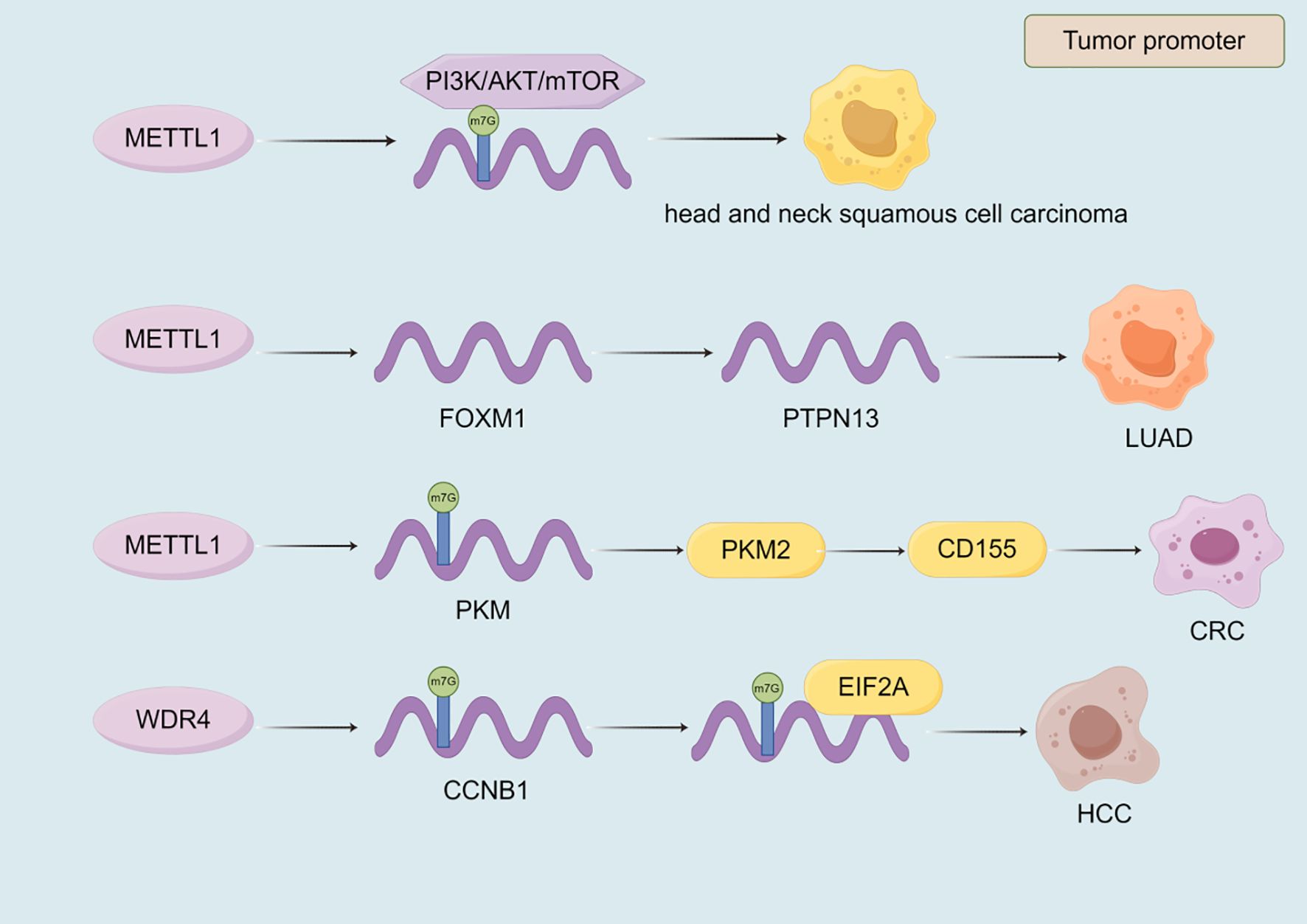 Figure 6. The role of m7G writers in the progression of malignant tumors. Most of the m7G writers currently discovered have a promoting effect in malignant tumors. METTL1 and WDR4 affect the progression of malignant tumors by regulating the expression of target genes, transcriptional stability, and signaling pathways.
