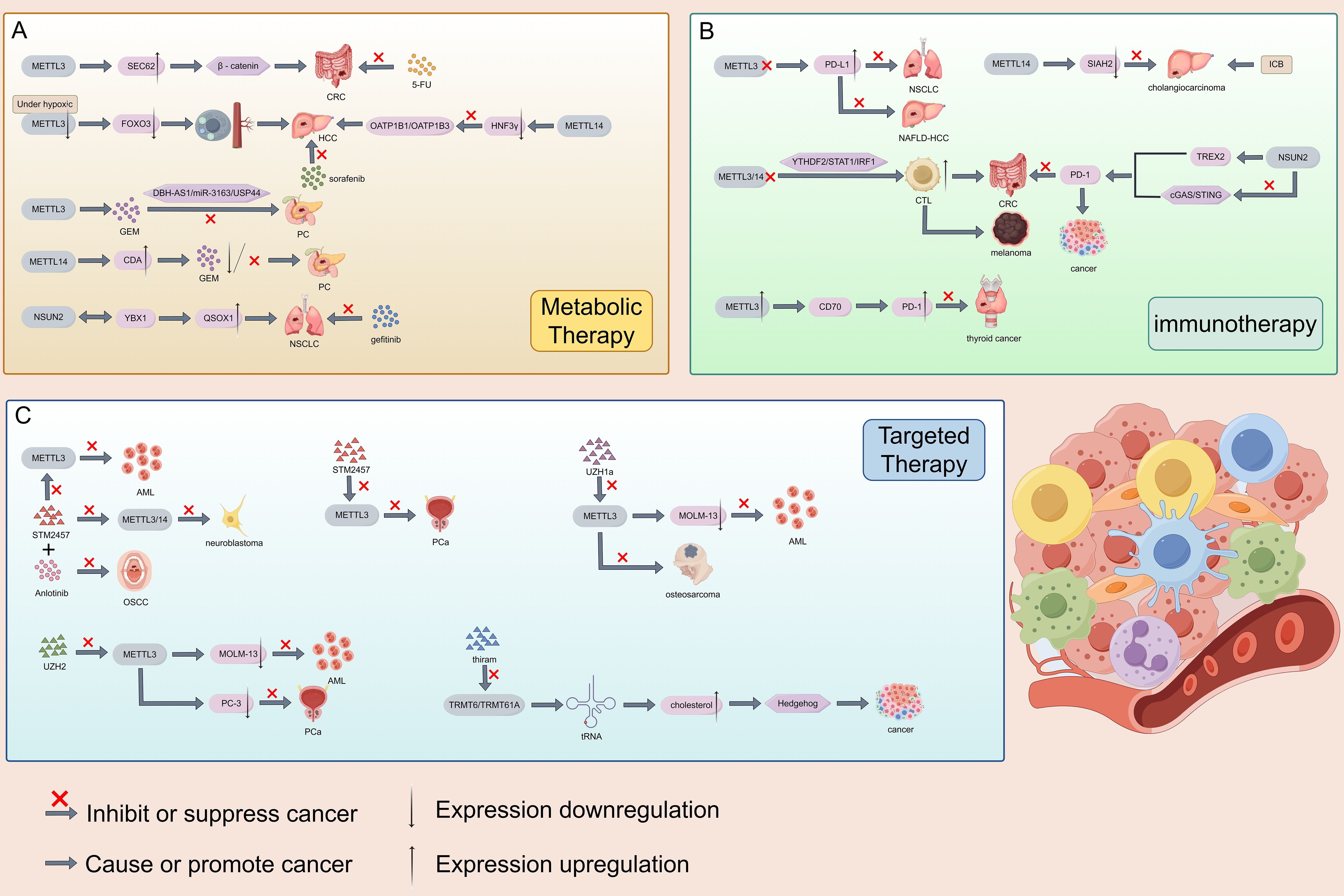 Figure 7. Clinical study on the treatment of malignant tumors using RNA methylation modified writers. There are currently three types of therapies, namely metabolic therapy, immunotherapy, and targeted therapy. Preliminary studies have shown that it is effective for malignant tumors such as CRC, HCC, and NSCLC.