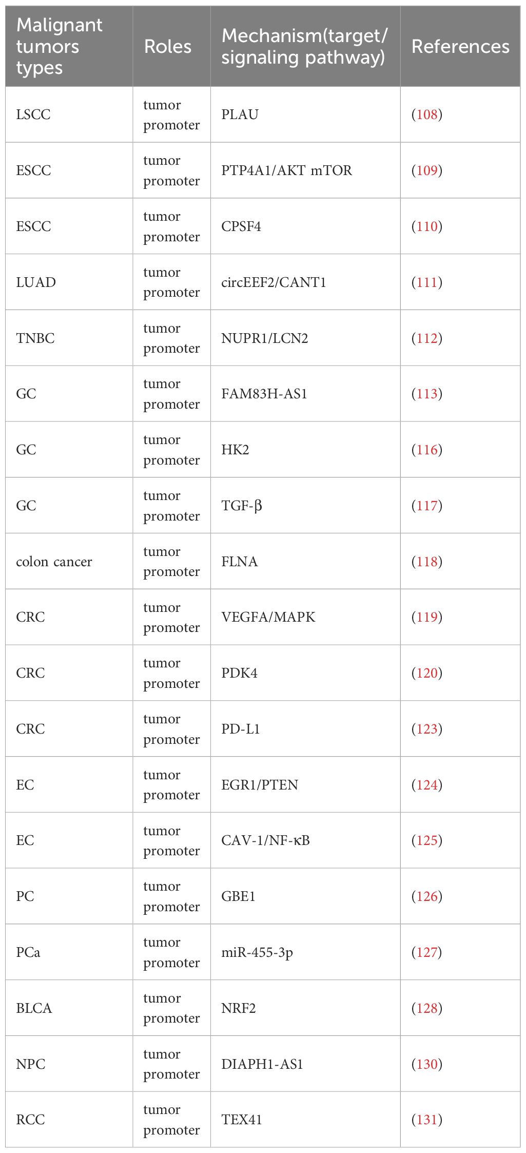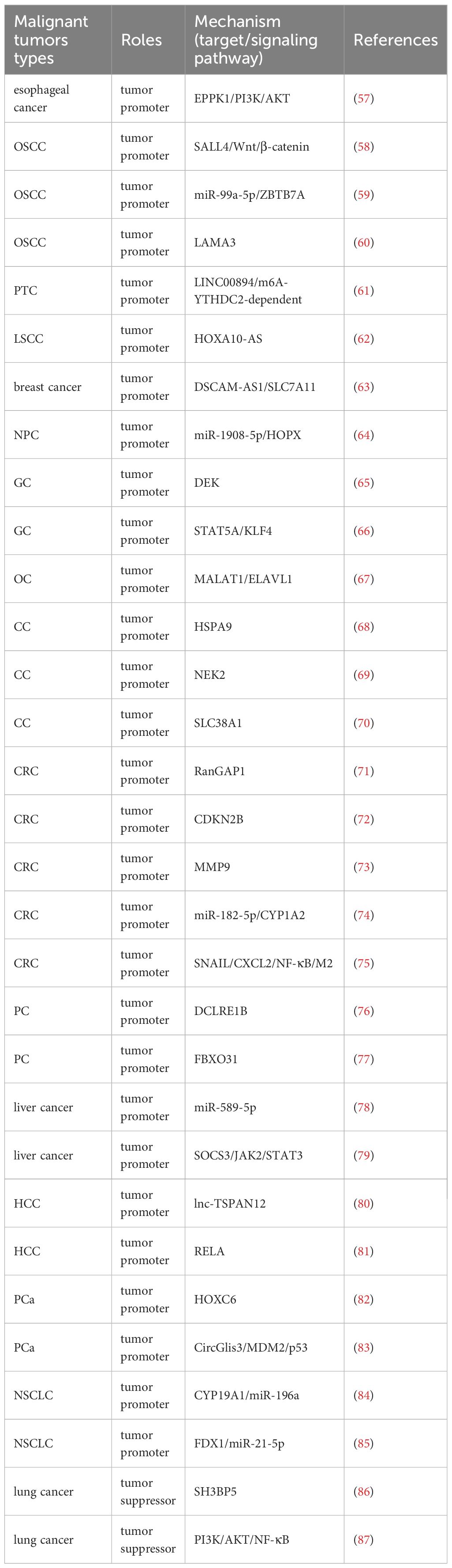 In recent years, a number of studies have found that METTL3 is involved in cancer development as a cancer promoting factor. METTL3 can promote the proliferation and metastasis of esophageal cancer cells (55) and renal cell carcinoma (RCC) cells (56). In addition, researchers have provided a new direction for cancer treatment through continuous exploration of its mechanism(Table 1). EPPK1 is a gene which inhabits the proliferation of esophageal cells obviously. METTL3, as a m6A writer, its deficiency can down-regulate the expression of EPPK1 and thereby inhibit the PI3K/AKT pathway, then curbing the development of esophageal cancer (57). METTL3 promotes cancer stem-like cell (CSC) phenotype in oral squamous cell carcinoma(OSCC) by targeting SALL4 through the Wnt/β-catenin signaling pathway (58). METTL3 mediates miR-99a-5p to drive OSCC cell metastasis through targeting ZBTB7A (59). METTL3 can also promote the occurrence of OSCC via m6A modification-dependent stabilization of LAMA3 transcripts (60). There are many kinds of lncRNAs, including LINC00894 (61), HOXA10-AS (62) and more. In papillary thyroid carcinoma (PTC), METTL3 can improve and enhance the stability of LINC00894 and thus promote the development of PTC through the m6A-YTHDC2-dependent pathway (61). METTL3 can modify lncRNA DSCAM-AS1 to enhance the stability of endogenous antioxidant factor SLC7A11, thereby inhibiting iron death and promoting the poor prognosis of breast cancer (63). In addition, METTL3 can promote the m6A modification of HOXA10-AS and enhance its RNA stability, thereby driving the malignant progression of laryngeal squamous cell carcinoma (LSCC) (62). LncRNA and related genes and their signaling pathways may be effective mechanistic targets for cancer treatment targeting METTL3. MicroRNAs also play a role in tumorigenesis. MiR-1908-5p is a type of microRNA that plays a role in the progression of nasopharyngeal carcinoma (NPC). METTL3 mediates the m6A modification of miR-1908-5p by targeting HOPX, thereby promoting the occurrence of NPC (64). METTL3 is involved in the m6A modification of the nuclear protein DEK, which improves the stability and expression of DEK, thereby promoting the proliferation and migration of gastric cancer (GC) cells (65). METTL3 mediates STAT5A regulation of KLF4 to promote proliferation and migration of GC cells (66). METTL3 promotes the development of ovarian cancer (OC) by increasing the mRNA level of oncogene MALAT1 through RNA binding protein ELAVL1 (67). METTL3 mediates HSPA9 m6A modification to promote the malignant development of cervical cancer (CC) (68). In another mechanism, METTL3 promotes the malignant progression of CC by up-regulating the expression of NEK2 (69). METTL3 can also enhance the stability of the glutamine transporter SLC38A1 mRNA, drive the growth of CC cells, and inhibit their apoptosis (70). METTL3 mediates Ran GTPase activating protein 1 (RanGAP1) to contribute to the progress of colorectal cancer (CRC) (71). METTL3 can promote the senescence of CRC cells through the mediator CDKN2B, providing a new target for the treatment of CRC (72). METTL3 mediated m6A modification of matrix metalloproteinase-9 (MMP9) mRNA promotes tumorigenicity of CRC (73). METTL3 can mediate the expression of circular RNA circ_0008345, which can bind to miR-182-5p and prevent miR-182-5p from inhibiting the oncogene CYP1A2, thereby contributing to the malignant progression of CRC (74). Meanwhile, METTL3 promotes epithelial-mesenchymal transition in CRC through m6A modification of SNAIL mRNA, where SNAIL enhances CXCL2 secretion through the NF-κB pathway to recruit M2 macrophages and promote CRC lung metastasis (75). METTL3 mediates m6A modification of exonuclease DCLRE1B to promote the development of pancreatic cancer (PC) (76). METTL3 induces m6A modification of FBXO31 and enhances its mRNA translation, thereby promoting the occurrence of PC (77). METTL3 mediates MiR‐589‐5p maturation and expression, which is positively correlated and over-expression can promote the deterioration of liver cancer (78). METTL3 promotes the proliferation and stemness of liver cancer stem cells (LCSCs) by targeting SOCS3 mRNA through the JAK2/STAT3 pathway (79). METTL3 mediates m6A modification of lnc-TSPAN12 to drive migration and invasion of hepatocellular carcinoma(HCC) cells, which in turn promotes hepatic metastasis (80). The transcription factor RELA can bind to the METTL3 promoter region to promote the transcription of METTL3, thereby promoting the malignant growth of HCC cells (81). Another circular RNA also plays a role in METTL13’s involvement in tumor progression. In prostate cancer (PCa), METTL3 induces homeobox C6 (HOXC6) m6A modification to stabilize its expression and promote cancer cell proliferation, invasion, migration, stemness, and glycolysis (82). METTL3 mediates CircGlis3 (HSA_CIRC_0002874) to up-regulate MDM2 and regulate the p53 signaling pathway, promoting PCa cell proliferation, migration, and invasion (83). Aromatase (CYP19A1) is an enzyme involved in limiting the rate of estrogen biosynthesis. METTL3 promotes estrogen production by enhancing CYP19A1 translation and mediates miR-196a, thereby driving non-small cell lung cancer (NSCLC) metastasis (84). In another mechanism, METTL3 promotes the occurrence and metastasis of NSCLC by inhibiting FDX1 by promoting the maturation of miR-21-5p (85). Due to different mechanisms, METTL3 can also play different roles in the same cancer. The over-expression of SH3 domain binding protein 5 (SH3BP5) can inhibit the invasion ability of lung cancer cells, METTL3 can mediate m6A modification to promote its expression, and METTL3 itself also has the function of inhibiting the migration and invasion of lung cancer cells, thereby METTL3 can inhibit the deterioration of lung cancer (86). METTL3 inhibits malignant progression of lung adenocarcinoma by blocking the PI3K/AKT/NF-κB signaling pathway (87). METTL3 exhibits a dual role in cancer,
