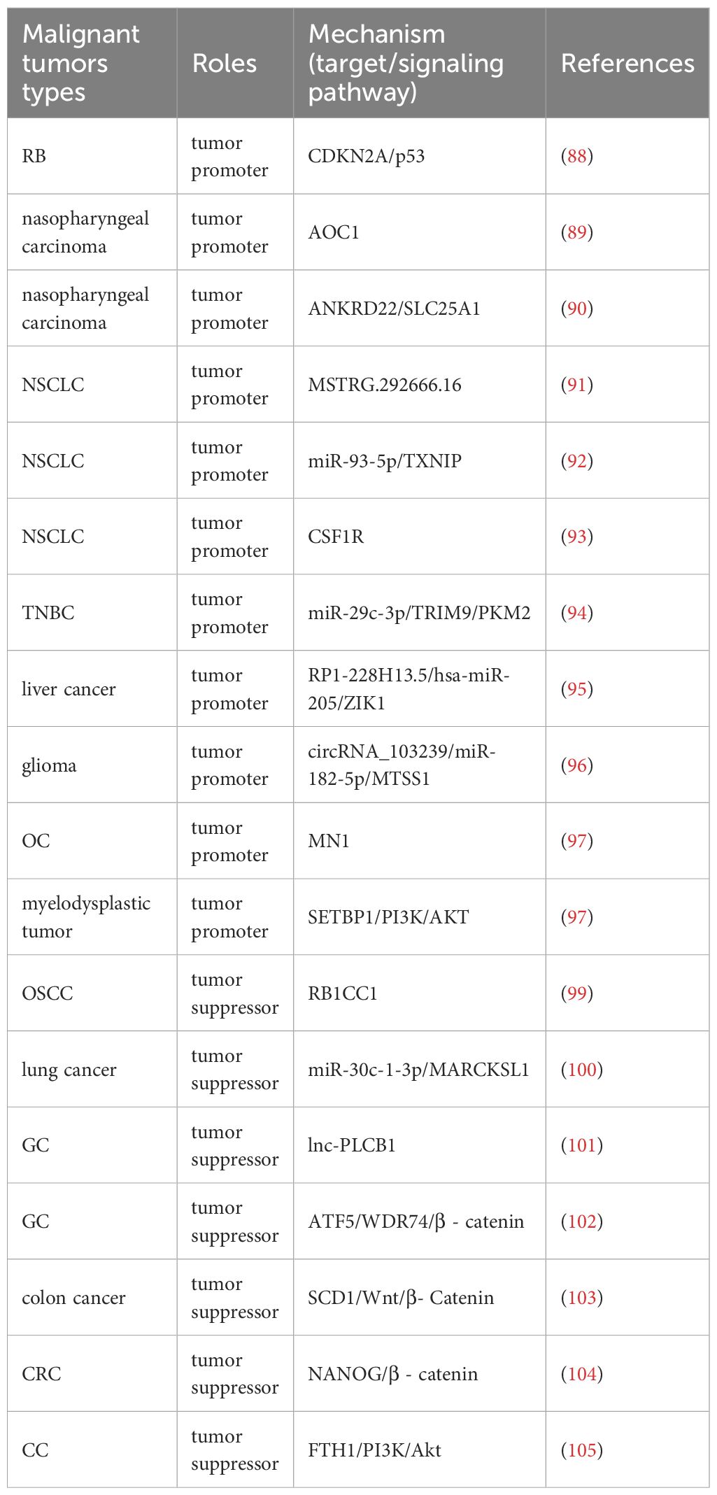 METTL14, as one of the main members of m6A writers, plays an important role in the mechanisms related to malignant tumors(Table 2). METTL14 enhances the m6A modification of CDKN2A, inhibits the activation of p53 pathway, and promotes retinoblastoma (RB) progression (88). In nasopharyngeal carcinoma, METTL14 promotes cancer progression by regulating the stability of AOC1 mRNA (89). METTL14 catalyzes m6A modification of ANKRD22 mRNA to improve mRNA stability and translation efficiency. At the same time, ANKRD22 interacts with SLC25A1 to increase intracellular acetyl-CoA content, promoting lipid metabolism reprogramming and cellular lipid synthesis, thereby advancing the progression of nasopharyngeal carcinoma (90). METTL14 can up-regulate the expression of lncRNA MSTRG.292666.16 and enhance the level of m6A modification, which can promote the development of NSCLC (91). In another mechanism, METTL14 increases miR-93-5p expression and matures pri-miR-93-5p through m6A alteration to target and inhibit TXNIP, thereby inhibiting NSCLC cell apoptosis and promoting cancer development and metastasis (92). Moreover, METTL14 can target CSF1R to accelerate the proliferation, migration, and invasion of NSCLC cells (93). METTL14 activates miR-29c-3p through m6A and regulates the ubiquitination of pyruvate kinase isoform M2 (PKM2) mediated by the tripartite motif containing 9 (TRIM9), driving aerobic glycolysis of glucose and promoting the progression of triple-negative breast cancer (TNBC) (94). METTL14 mediates lncRNA RP1-228H13.5 to promote the development of liver cancer through targeting hsa-miR-205 and regulating the expression of zinc finger protein interacting with K protein 1 (ZIK1) (95). In glioma cells, downregulation of METTL14 induces down-regulation of m6A modification and expression of circRNA_103239, driving up-regulation of miR-182-5p and down-regulation of MTSS1, thereby promoting EMT in glioma and promoting tumor progression (96). METTL14 targets downstream gene MN1 to enhance its stability and translation efficiency, thereby promoting malignant progression of OC (97). METTL14, by forming the METTL3-METTL14 complex, enhances the m6A modification of SETBP1 mRNA, thereby increasing the stability of SETBP1 mRNA and subsequently activating the PI3K-AKT signaling pathway to promote cell proliferation in myelodysplastic tumors (98). In addition, METTL14 also plays an equally important role in inhibiting the progression of malignant tumors. METTL14 promotes autophagy in OSCC cells and inhibits its progression by targeting the autophagy related gene RB1CC1 through m6A modification (99). METTL14 mediates miR-30c-1-3p maturation, and miR-30c-1-3p targets MARCKSL1 to inhibit its expression, thereby suppressing the development of lung cancer through this mechanism (100). METTL14 up-regulates the m6A level of lnc-PLCB1 to enhance its stability and inhibit the migration and invasion of GC cells (101). METTL14 promotes the degradation of ATF5 mRNA, reduces WDR74 transcription and β - catenin nuclear translocation, thereby inhibiting GC cell stemness and slowing down cancer progression (102). In colon cancer, METTL14 targets SCD1, and its over-expression significantly enhances the m6A modification of SCD1 mRNA and reduces SCD1 mRNA levels, possibly through SCD1 mediated Wnt/β- Catenin signaling inhibits the stemness and metastasis of colon cancer cells, thereby hindering the tumorigenic process of colon cancer (103). METTL14 inhibits the expression of transcription factors NANOG and β-catenin in CRC cells, thereby inhibiting the phenotype of CRC stem cells and hindering cancer progression (104). METTL14 targets FTH1 to reduce its mRNA stability, thereby enhancing sorafenib induced ferroptosis and helping to inhibit CC progression through the PI3K/Akt signaling pathway (105). Similar to METTL3, METTL14 also exhibits dual functionality. The role of METTL14 may be related to its cooperative relationship with METTL3 and other co factors. When dissociated from METTL3, METTL14 may be more inclined to stabilize tumor suppressor RNA. This suggests that targeting the METTL3-METTL14 interaction interface may be a more precise strategy than comprehensive inhibition (Table 2).