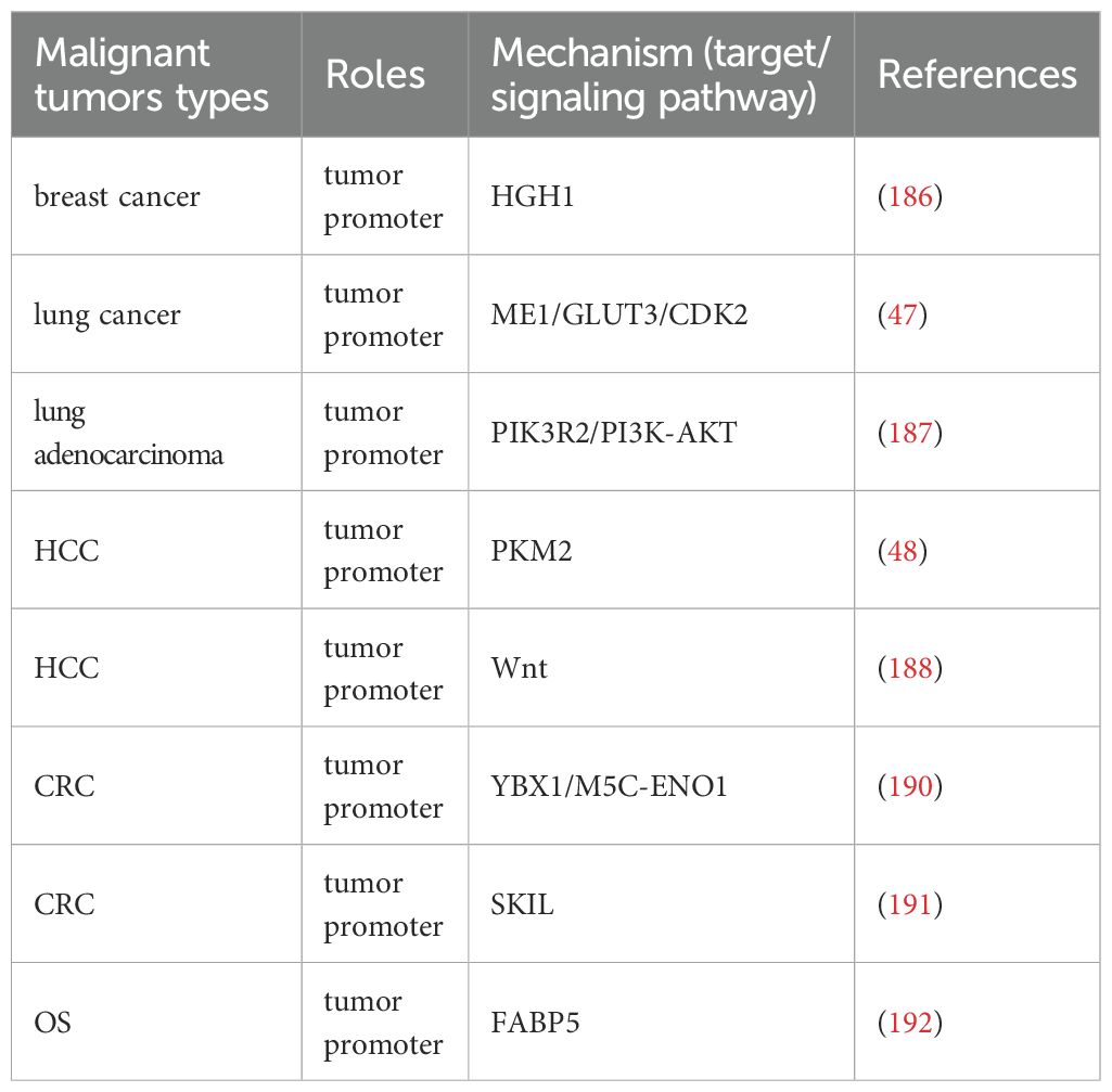 NSUN2 plays a pivotal role in the development and progression of various cancers by regulating gene expression and enhancing mRNA stability, serving as a key hub connecting m5C modification with tumor malignancy phenotype (Table 4, Figure 5). In breast cancer, NSUN2 promotes tumorigenesis by modulating the expression of HGH1 and stabilizing its mRNA, suggesting that HGH1 could be a potential therapeutic target (186). Similarly, in lung cancer, NSUN2 facilitates metabolic reprogramming and drives Cr(VI)-induced malignant transformation by stabilizing the mRNA of key genes such as ME1, GLUT3, and CDK2 (47). Furthermore, NSUN2 up-regulates PIK3R2 and enhances its mRNA stability, leading to the activation of the PI3K-AKT signaling pathway and promoting the malignant progression of lung adenocarcinoma, highlighting its potential as a therapeutic target (187). In HCC, NSUN2 contributes to tumor progression by up-regulating PKM2 and stabilizing its mRNA, thereby promoting glycolysis and offering potential therapeutic avenues for HCC patients (48). Additionally, NSUN2 regulates the Wnt signaling pathway to enhance HCC cell proliferation and migration (188). Notably, Niu et al. discovered that NSUN2 lactylation drives drug resistance in cancer cells, suggesting that targeting NSUN2 lactylation could be an effective strategy to improve patient outcomes (189). In CRC, NSUN2 exerts its oncogenic effects through the NSUN2/YBX1/m5C-ENO1 signaling axis, providing a rationale for combining NSUN2 inhibitors in CRC treatment (190). Moreover, NSUN2 induces m5C modification of SKIL, enhancing its mRNA stability and promoting CRC progression (191). In OS, NSUN2 up-regulates FABP5 expression and stabilizes its mRNA, thereby promoting fatty acid metabolism in OS cells and driving tumor progression (192). These mechanisms indicate that NSUN2 acts as a metabolic core regulator, reshaping glycolysis and fatty acid metabolism by stabilizing key metabolic enzymes such as PKM2 and ENO1 mRNA. NSUN2 also mediates the malignant transformation induced by environmental carcinogen Cr (VI), revealing its special significance in the occurrence of environment related tumors. These findings suggest its enormous potential as a combination therapy target, but highly selective inhibitors need to be developed to overcome the potential toxicity caused by its underlying physiological functions (Figure 5, Table 4).