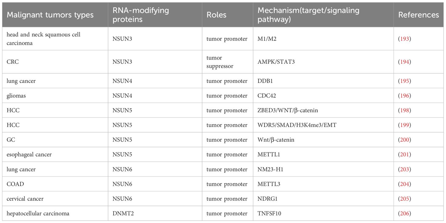 Numerous m5C modification writers are implicated in the progression of malignant tumors and offer potential therapeutic insights (Table 5). For instance, knocking down NSUN3 increases the infiltration of M1 macrophages while reducing M2 macrophages, thereby promoting the progression of head and neck squamous cell carcinoma (193). In CRC, NSUN3 knockdown activates AMPK-related signaling and inhibits STAT3 signaling, leading to anti-phosphorylation and pro-apoptotic effects, which suppress CRC cell proliferation and migration (194). These findings suggest that NSUN3 inhibitors could serve as a novel therapeutic strategy for malignant tumors. NSUN4 mediates m5C modification of Circacteri3, which targets DNA binding protein 1 (DDB1), affecting mitochondrial function and energy metabolism, and thereby promoting lung cancer development (195). In gliomas, NSUN4 drives malignant progression by increasing the stability of CDC42 mRNA (196). Additionally, NSUN4 exacerbates liver cancer and may serve as a new prognostic marker for liver cancer (197). NSUN5 promotes HCC cell proliferation through the ZBED3/WNT/β-catenin signaling pathway (198). It also recruits WDR5 to enrich trimethylated histone H3 at lysine 4 (H3K4me3) in the SMAD3 promoter region, where SMAD3 mediates the EMT pathway, further promoting HCC progression (199). In GC, NSUN5 activates the Wnt/β-catenin signaling pathway, promoting immune escape and malignant progression (200). Moreover, NSUN5 directly binds to METTL1 transcripts, enhancing their m5C modification and driving the malignant progression of esophageal cancer (201). In glioblastoma (GBM), NSUN5 enhances protein synthesis necessary for tumor progression, thereby promoting malignancy (202). In lung cancer, NSUN6 regulates the expression of NM23-H1, promoting cancer cell proliferation, migration, and EMT (203). In COAD cells, NSUN6 up-regulates METTL3 expression and mediates its m5C modification, facilitating cancer progression (204). Additionally, NSUN6 promotes m5C modification of NDRG1 mRNA, driving resistance to radiotherapy in cervical cancer (205). Targeting NSUN6 through these mechanisms may represent a promising approach to improve the poor prognosis of malignant tumors. Lastly, DNMT2 targets the pro-apoptotic gene TNFSF10 (TRAIL), promoting the proliferation of hepatocellular carcinoma cells (206). The above mechanism indicates that different m5C writers play highly specialized roles in tumorigenesis by regulating the fate of specific RNAs. NSUN4 can affect energy metabolism through mitochondrial associated RNA (such as circERI3), revealing the unique function of m5C at the subcellular level. NSUN3 and NSUN5 have begun to demonstrate their ability to regulate the tumor immune microenvironment, affecting macrophage polarization and T cell function, providing new targets for combined immunotherapy. In the future, it is necessary to continue exploring effective strategies targeting m5C modification to reverse tumor metabolic abnormalities and overcome immune resistance (Table 5).