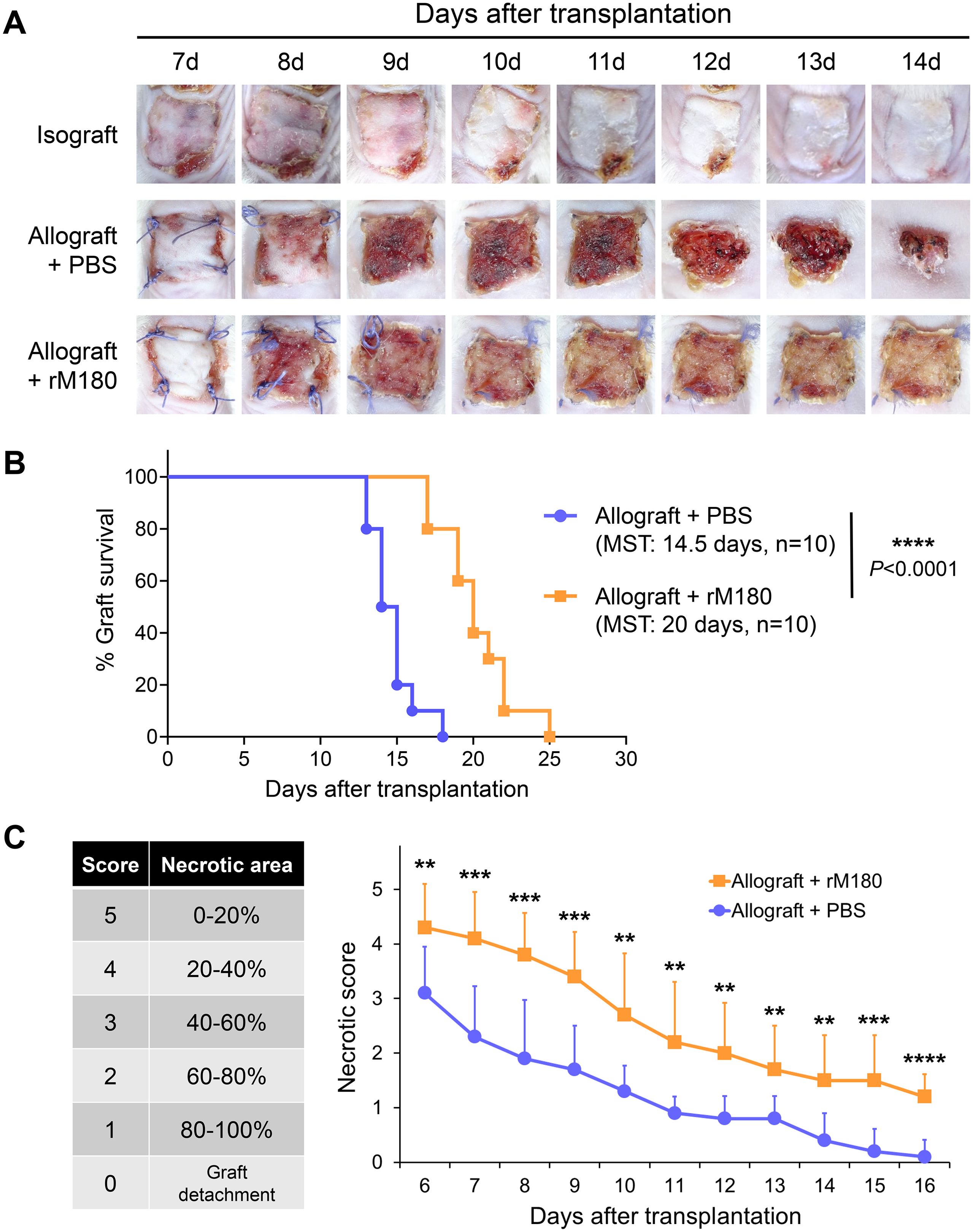 Figure 1. rM180 amelogenin prolongs the survival of skin allograft. (A) The photographs of the graft rejection have been shown in the isograft group (upper panel), PBS-treated allograft group (middle panel), and rM180-treated allograft group (lower panel) from day 7 to 14 post-transplantation. (B) Kaplan-Meier survival curves of allografts from rM180 treatment (n = 10) and PBS-treated (n = 10) groups by day of post-transplantation. The data were analyzed using GrafPad Prism 10.4.1. The significance of differences between groups was determined using log-rank tests; ****P < 0.0001. (C) Statistical analysis of necrotic levels of grafts from day 6 to 16 post-transplantation. Different score levels indicate different necrotic areas of skin allografts treated with rM180 or PBS. The significance of differences between groups was determined using a two-tailed unpaired Student’s test; **P < 0.01; ***P < 0.001; ****P < 0.0001. Data represent mean ± SD. Similar results were obtained in ten independent experiments. PBS, phosphate-buffered saline; MST, median survival time.