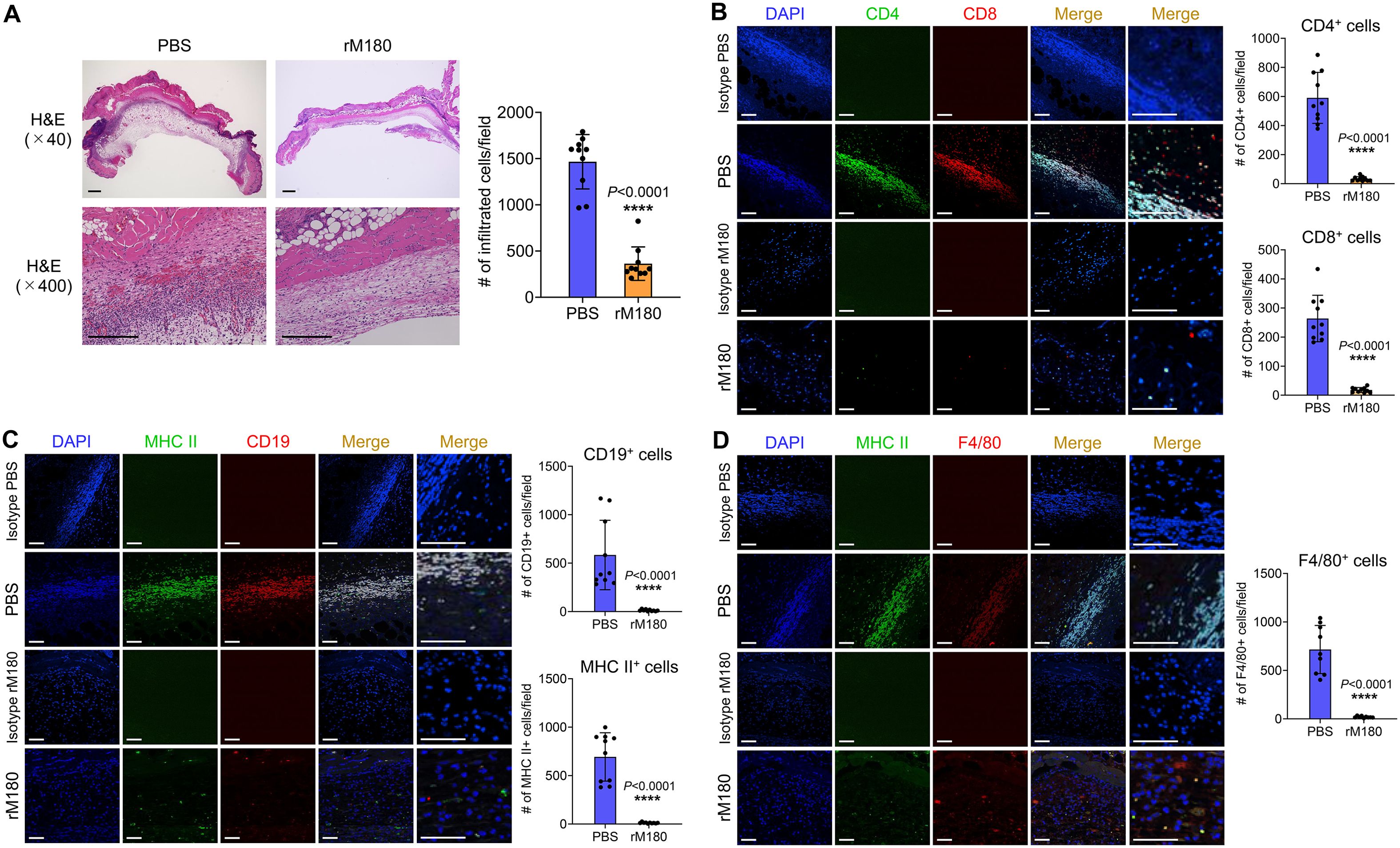 Figure 2. Transplantation with rM180 reduces T cell, B cell, and macrophage infiltration into the allograft skin. The skin allografts were harvested at seven days post-transplantation. (A) Representative images of H&E staining of allografts from the rM180 and PBS groups. Quantification of H&E staining corresponding to the two groups on day 7. Scale bars: 500 μm. (B–D) Representative images of immunohistofluorescence staining for CD4 and CD8 (B), CD19 and MHC II (C), F4/80 and MHC II (D), or isotype controls in the rM180 and PBS groups. Quantification of immunohistofluorescence staining corresponding to the two groups on day 7. Scale bars: 500 μm. The significance of differences between groups was determined using a two-tailed unpaired Student’s test; ****P < 0.0001. Data represent mean ± SD. Similar results were obtained in ten independent experiments. H&E, hematoxylin and eosin.