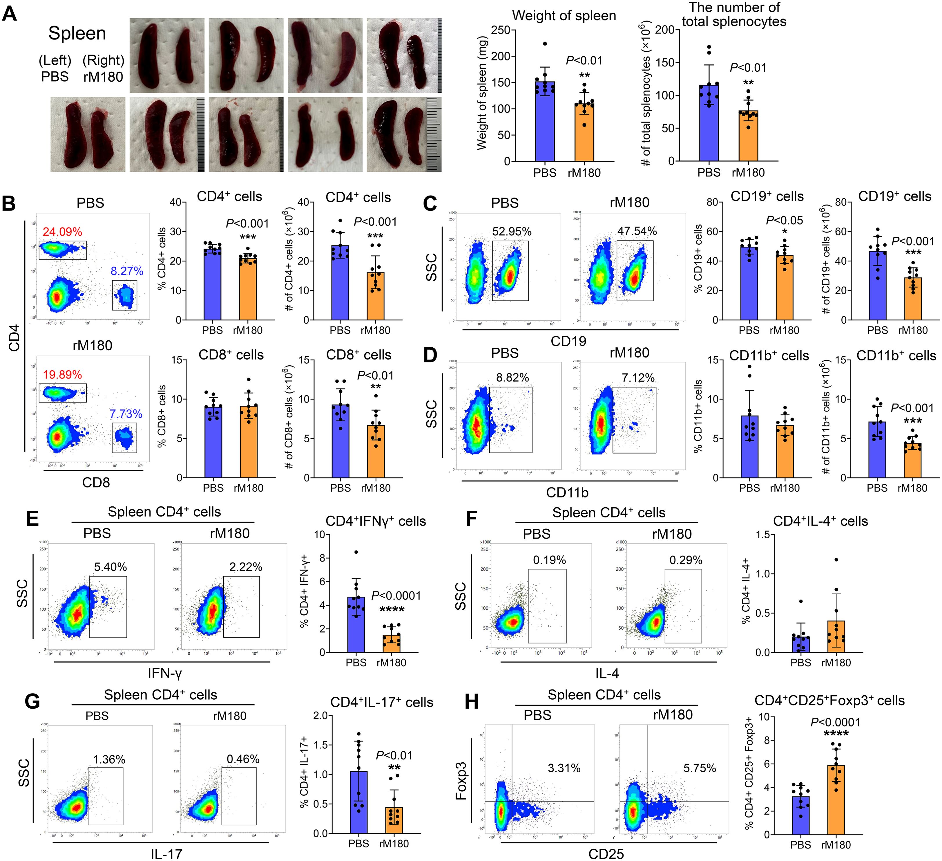 Figure 4. Local application of rM180 is associated with less severe inflammation in the spleen. (A) The photographs of the spleens have been shown in the rM180 group (right) and the control group (left) from day 7 post-transplantation. Quantification of the weight of the spleen and the number of total splenocytes corresponding to the two groups on day 7. (B–D) Flow cytometry was used for quantification of the percentages and the number of CD4+ and CD8+ T cells (B), CD19+ B cells (C), and CD11b+ macrophages (D) in the spleen of the rM180 and control groups. (E–H) All plots were gated on live CD4+ T cells. Representative plots and bar graphs display the percentages of IFN-γ+ (E), IL-4+ (F), IL-17+ (G), and CD25+ Foxp3+ (H) cells in the spleen of the rM180 and control groups. The significance of differences between groups was determined using a two-tailed unpaired Student’s test; *P < 0.05; **P < 0.01; ***P < 0.001; ****P < 0.0001. Data represent mean ± SD. Similar results were obtained in ten independent experiments.