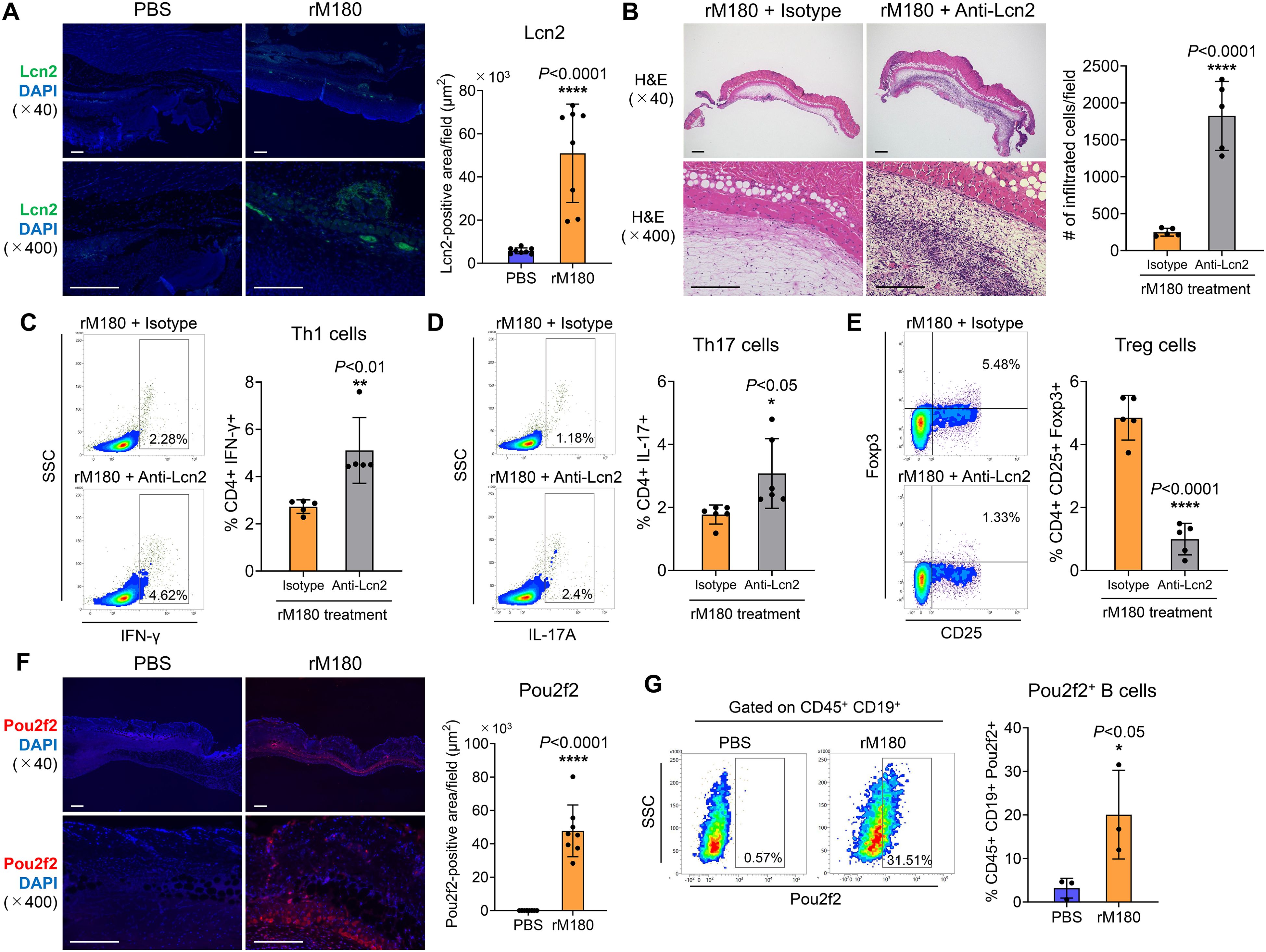 Figure 6. Lcn2 and Pou2f2 expression in skin allografts. (A) The skin allografts were harvested at four days post-transplantation. Representative images immunohistofluorescence staining for Lcn2 of allografts in the rM180 and PBS groups. Quantification of immunohistofluorescence staining corresponding to the two groups on day 4. Scale bars: 500 μm. (B) Representative images H&E staining of allografts from the rM180 group injected with neutralizing antibody targeting Lcn2 (anti-Lcn2) or isotype control. Quantification of H&E staining corresponding to the two groups on day 7. Scale bars: 500 μm. (C–E) All plots were gated on live CD4+ T cells. Representative plots and bar graphs display the percentages of IFN-γ+ (C), IL-17+ (D), and CD25+ Foxp3+ (E) cells in the spleen of the rM180 group injected with anti-Lcn2 or isotype control on day 7. (F) Representative images of immunohistofluorescence staining for Pou2f2 of allografts in the rM180 and PBS groups. Quantification of immunohistofluorescence staining corresponding to the two groups on day 4. (G) All plots were gated on live CD45+ CD19+ cells using flow cytometry. Representative plots and bar graph display the percentages of Pou2f2+ B cells in skin allografts of the rM180 and control groups. The significance of differences between groups was determined using a two-tailed unpaired Student’s test; *P < 0.05; ****P < 0.0001. Data represent mean ± SD. Similar results were obtained in eight (A, F), five (B–E), or three (G) independent experiments.