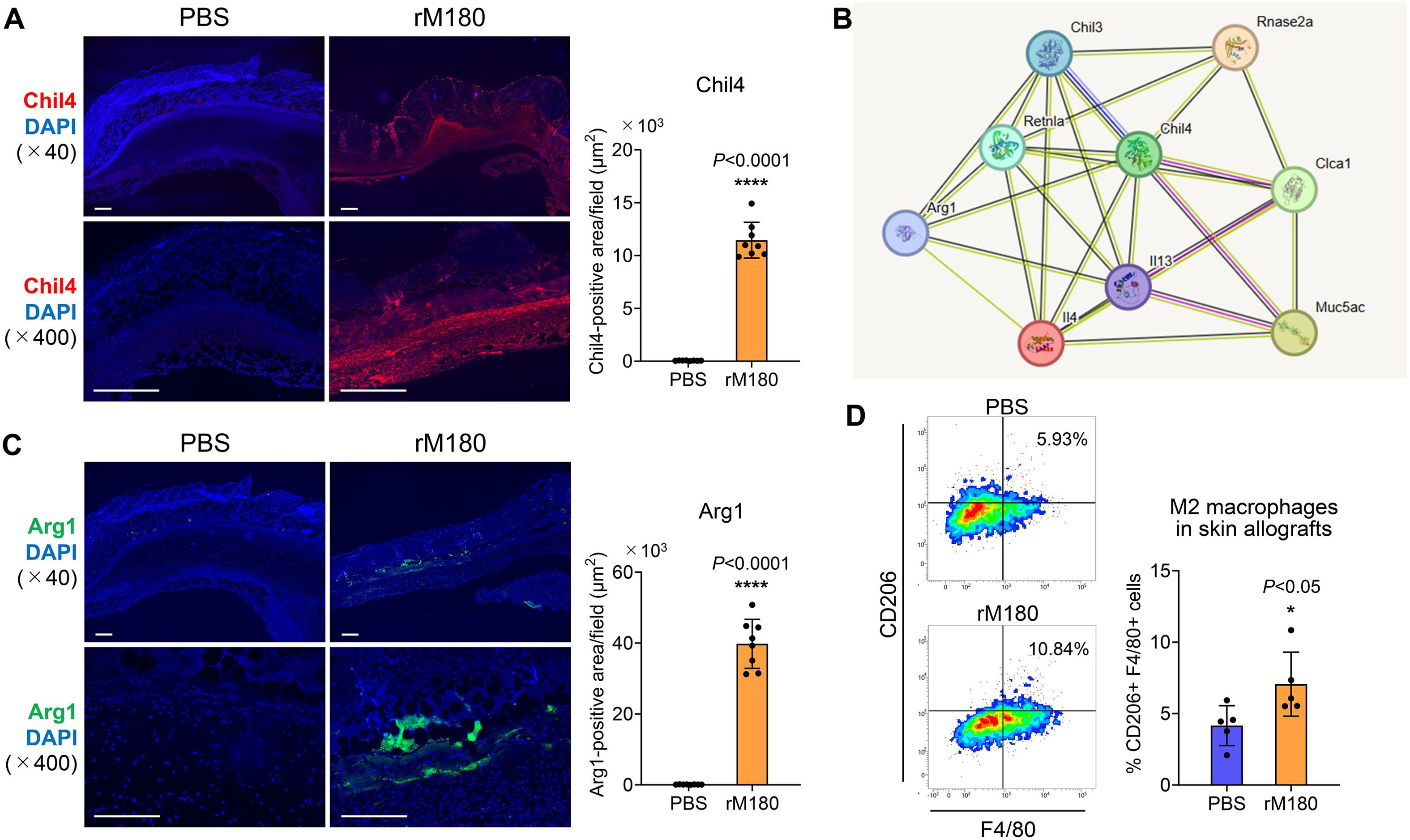 Figure 7. rM180 enhanced Chil4 expression and induced M2 macrophage polarization in skin graft recipients. The skin allografts were harvested at six days post-transplantation. (A, C) Representative images immunohistofluorescence staining for Chil4 (A) and Arg1 (C) of allografts in the rM180 and PBS groups. Quantification of immunohistofluorescence staining corresponding to the two groups on day 6. Scale bars: 500 μm. (B) PPI analysis and screening of the hub gene and key signaling pathways in DEGs. (D) Representative plots and bar graphs display the percentages of CD206+F4/80+ M2 macrophages in skin allografts of the rM180 the control groups using flow cytometry. The significance of differences between groups was determined using a two-tailed unpaired Student’s test; *P < 0.05; ****P < 0.0001. Data represent mean ± SD. Similar results were obtained in eight (A, C) or five (D) independent experiments.