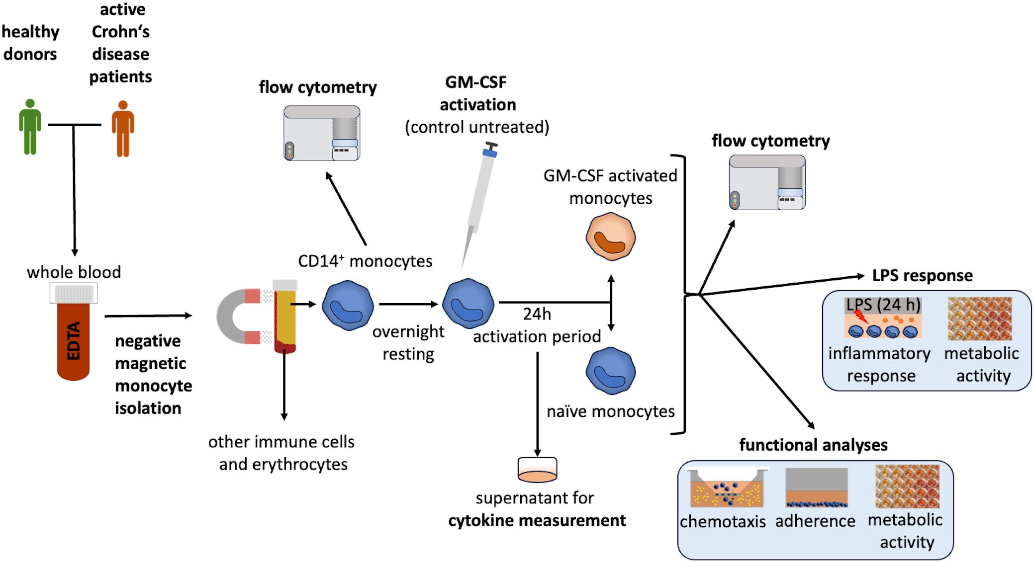To test our hypothesis, classical monocytes of aCD patients were isolated and activated ex vivo with GM-CSF. Their response was characterized by the measurement of cytokine secretion and surface protein expression related to homing, migration, and intercellular communication. The resulting GMaMs were tested in functional assays for adherence, migratory capacity, metabolic activity, and cytokine production. Moreover, GMaMs were stimulated with lipopolysaccharides (LPS) as an experimental model for the response to potential intestinal bacterial stimuli. To identify the inflammatory profile of GMaMs following LPS stimulation, we evaluated markers of both pro- and anti-inflammatory responses. We included measurements of Tryptophan (TRP) and Kynurenine (KYN) as markers of an anti-inflammatory pathway relevant to monocytes’ LPS response (14). The degradation of TRP by Indoleamine 2,3-dioxygenase (IDO) along the KYN pathway plays a crucial role in the regulation of the immune response, notably as a counter-regulatory mechanism in the context of inflammation and immune metabolism (15). It has been shown that IDO expression in dendritic cells or macrophages suppresses T-cells by depriving TRP (16). Additionally, it has been shown that KYN inhibits T-cell-mediated inflammation by suppressing T-cell proliferation (17). As a control, all tests were also performed with monocytes from HDs to account for effects related to active disease in the monocytes of aCD patients.
