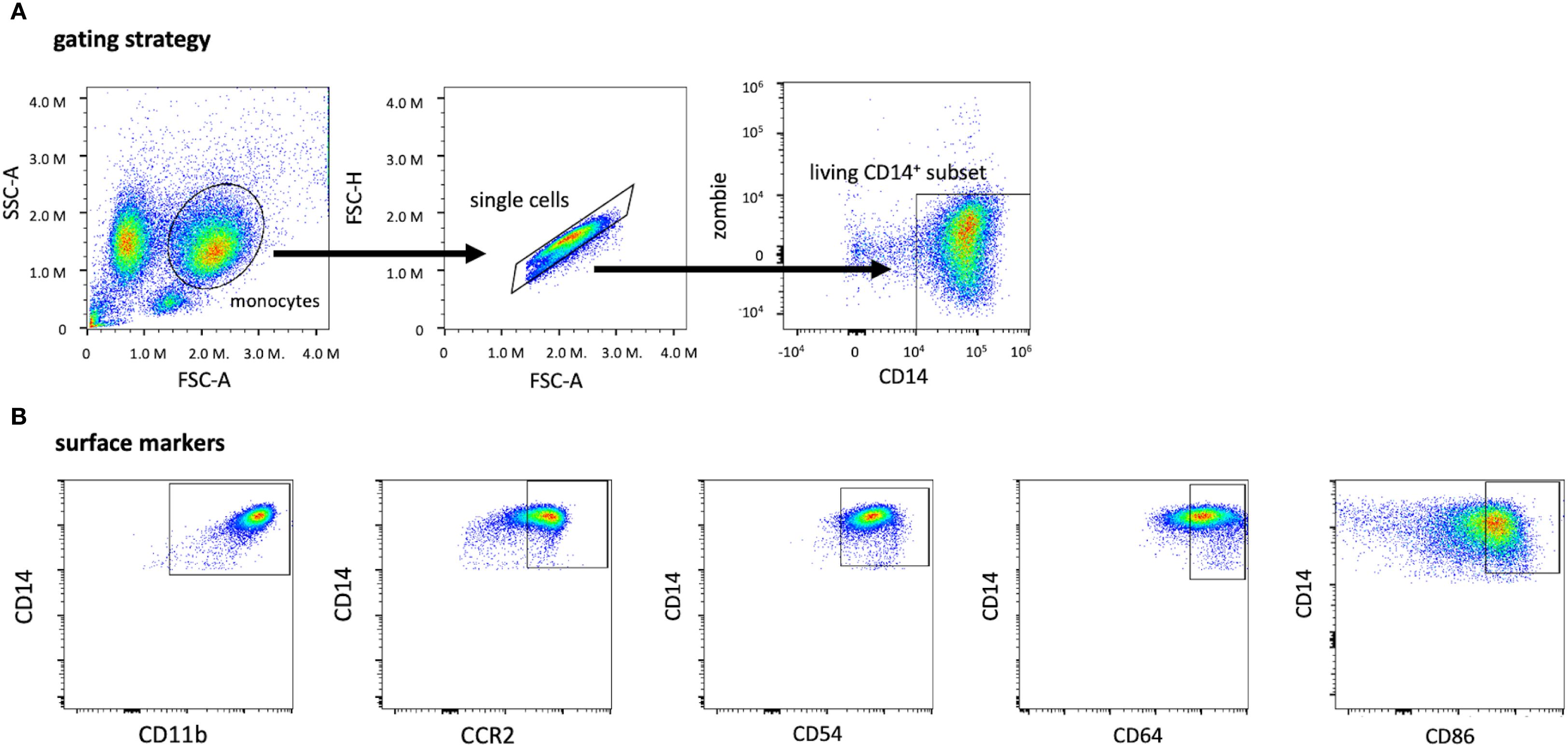 Figure 2. Gating strategy for identifying living CD14+ monocytes and subsets of CD14+ monocytes expressing other surface markers. The monocyte population was first identified by applying the singlet gate and gating on the living CD14+ Zombie-gate (A). Based on the living CD14+ subset, these graphs depict the expression of the surface markers CD11b, CCR2 (CD192), CD54, CD64, and CD86 after monocyte isolation (B). The threshold for CD14+, Zombie- cells and the surface markers were evaluated by using the FMO method with the full stain containing all selected colors on the panel. CD, cluster of differentiation; FMO, Fluorescence minus one; FSC-A, forward scatter area; SSC-A, sideward scatter area.