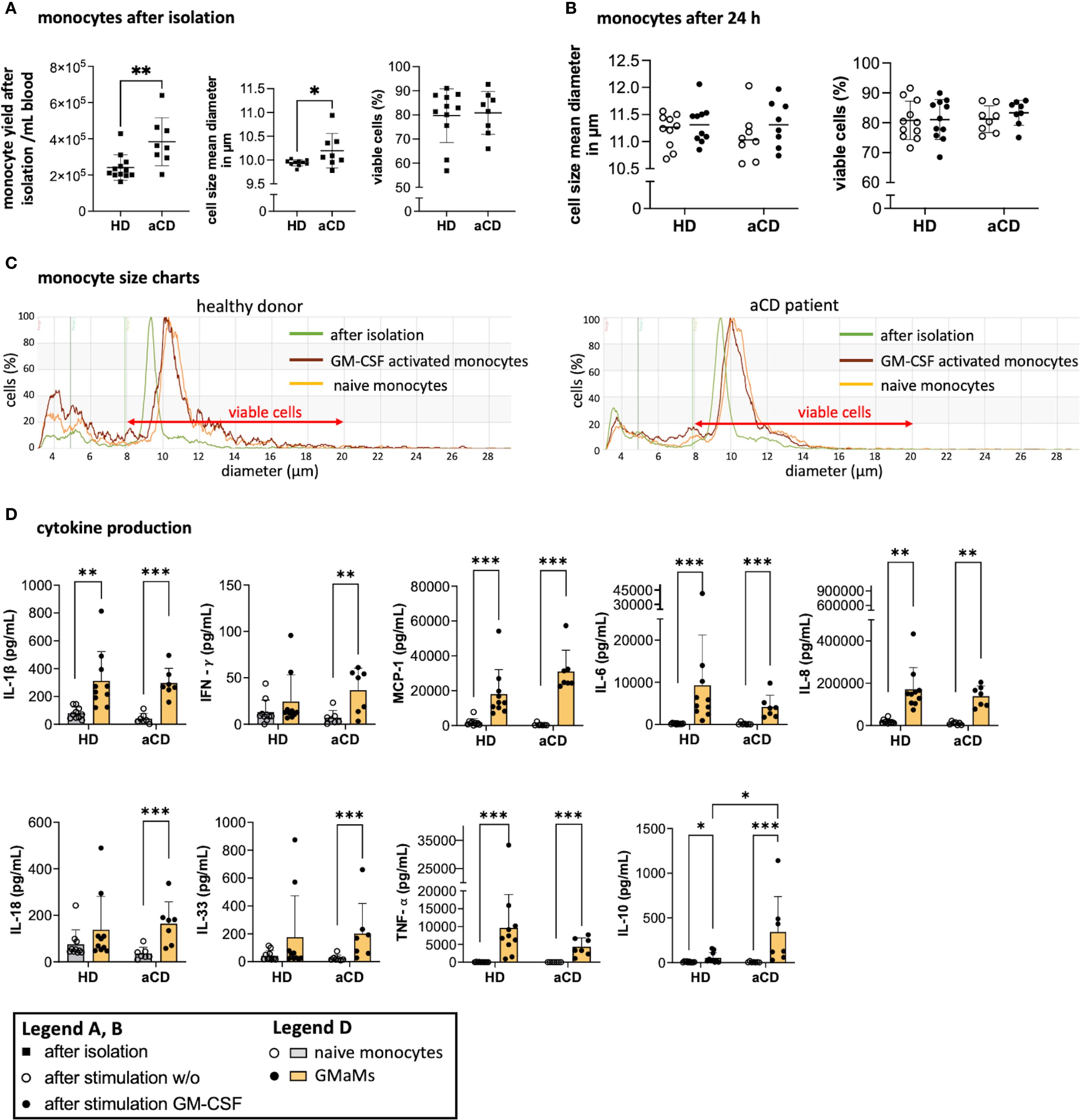 In conclusion, monocytes from aCD patients exhibit a higher yield and size compared to those isolated from HDs, as well as an increased secretion of IL-10 following GM-CSF activation 24h after stimulation. Both groups exhibit elevated production of pro-inflammatory cytokines following GM-CSF activation; however, only aCD monocytes display significant increases in IFN-γ and IL-33.