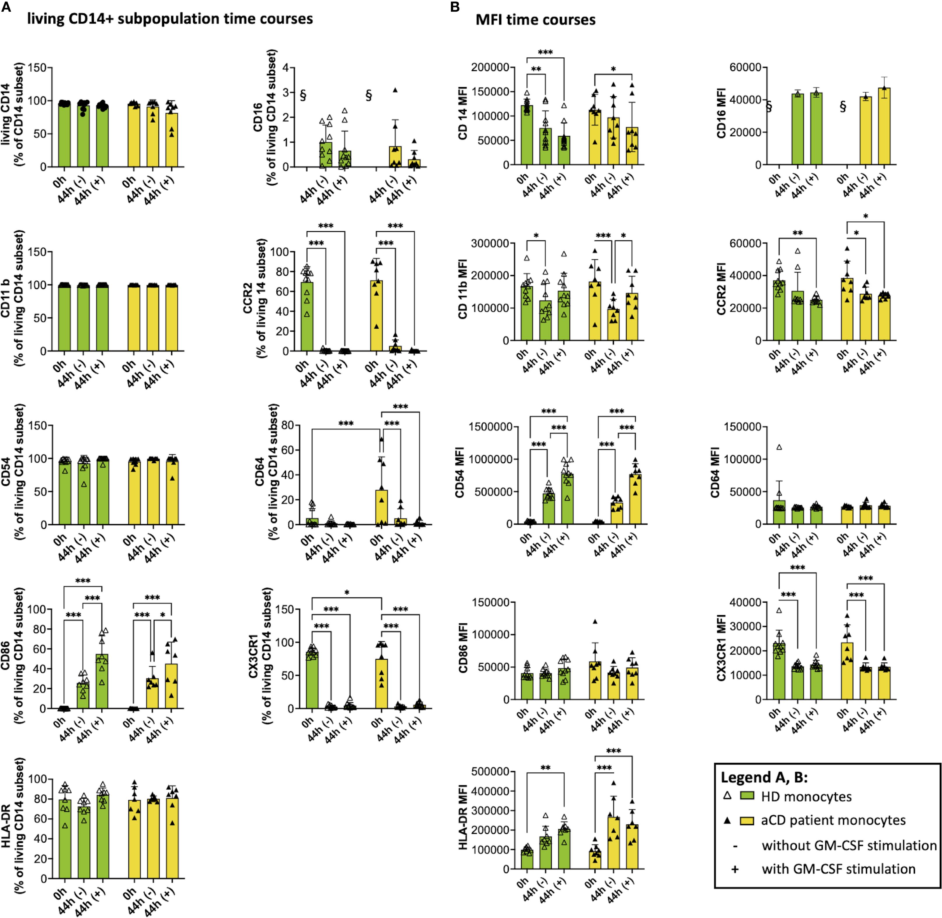Figure 5. Surface marker expression and median fluorescence intensity (MFI) after isolation and after cell culture (with and w/o GM-CSF). The graphs show flow cytometry measurements of monocytes after isolation (0h) and after being incubated with (44h +) or without GM-CSF (44h -). A shows the subpopulation of living CD14+ monocytes expressing the respective surface marker, and B shows the MFI of monocytes. Both groups (healthy donors and patients with aCD) are shown. Surface marker thresholds were gated using fluorescence minus one (FMO). Results are presented as single dots for each individual and as bars indicating Means + SD. Multiple pairwise comparisons were performed using the Tukey procedure. (A, B) (HD) = 10, n(aCD) = 7 – 8; *p < 0.05, **p < 0.01, ***p < 0.001. § - no data because no CD16+ monocytes were isolated according to the selected isolation procedure. Only significant comparisons are shown. aCD, active Crohn’s disease; CD, cluster of differentiation; GM-CSF, granulocyte-macrophage colony-stimulating factor; GMaMs, GM-CSF-activated monocytes; HD, healthy donors; HLA, human leukocyte antigen; MFI, median fluorescence intensity; SD, standard deviation.
