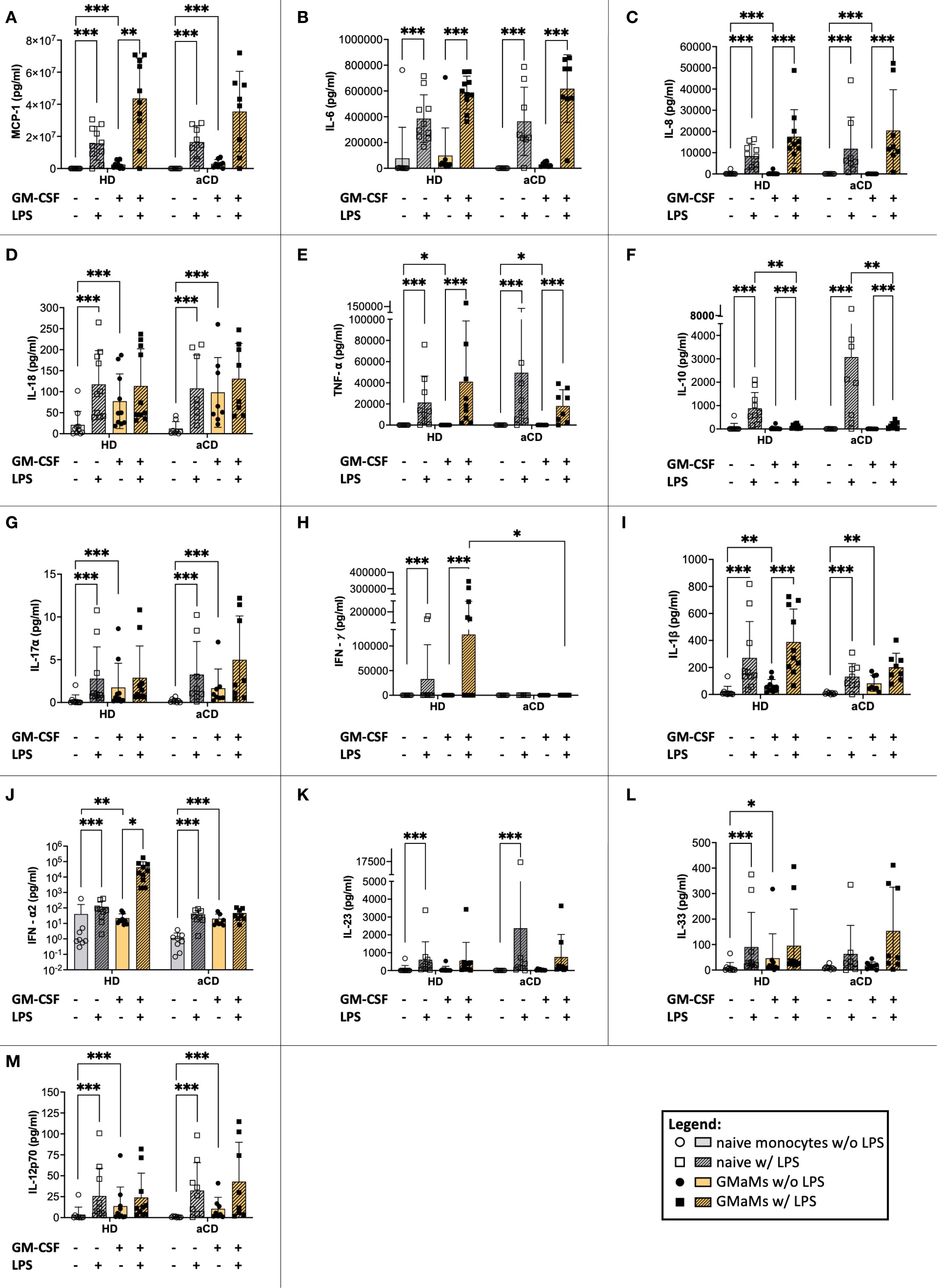 Figure 6. Response of GMaMs and naïve monocytes to LPS. Cytokine levels were measured after 24h of LPS stimulation using the LegendPlex™ or ELISA. Results are presented as single dots for each individual and bars indicate means + SD. Pairwise comparisons were performed using the Tukey test. (J) y-axis shown log 10 transformed to improve visualization. (A-M) n(HD) = 10, n(aCD) = 8; *p < 0.05, **p < 0.01, ***p < 0.001. Only significant comparisons are shown. aCD, active Crohn’s disease; ELISA, enzyme-linked immunoassay; GM-CSF, granulocyte-macrophage colony-stimulating factor; HD, healthy donors; IFN, interferon; IL, interleukin; LPS, lipopolysaccharides; MCP-1, monocyte chemoattractant protein 1; SD, standard deviation; TNF, tumor necrosis factor.