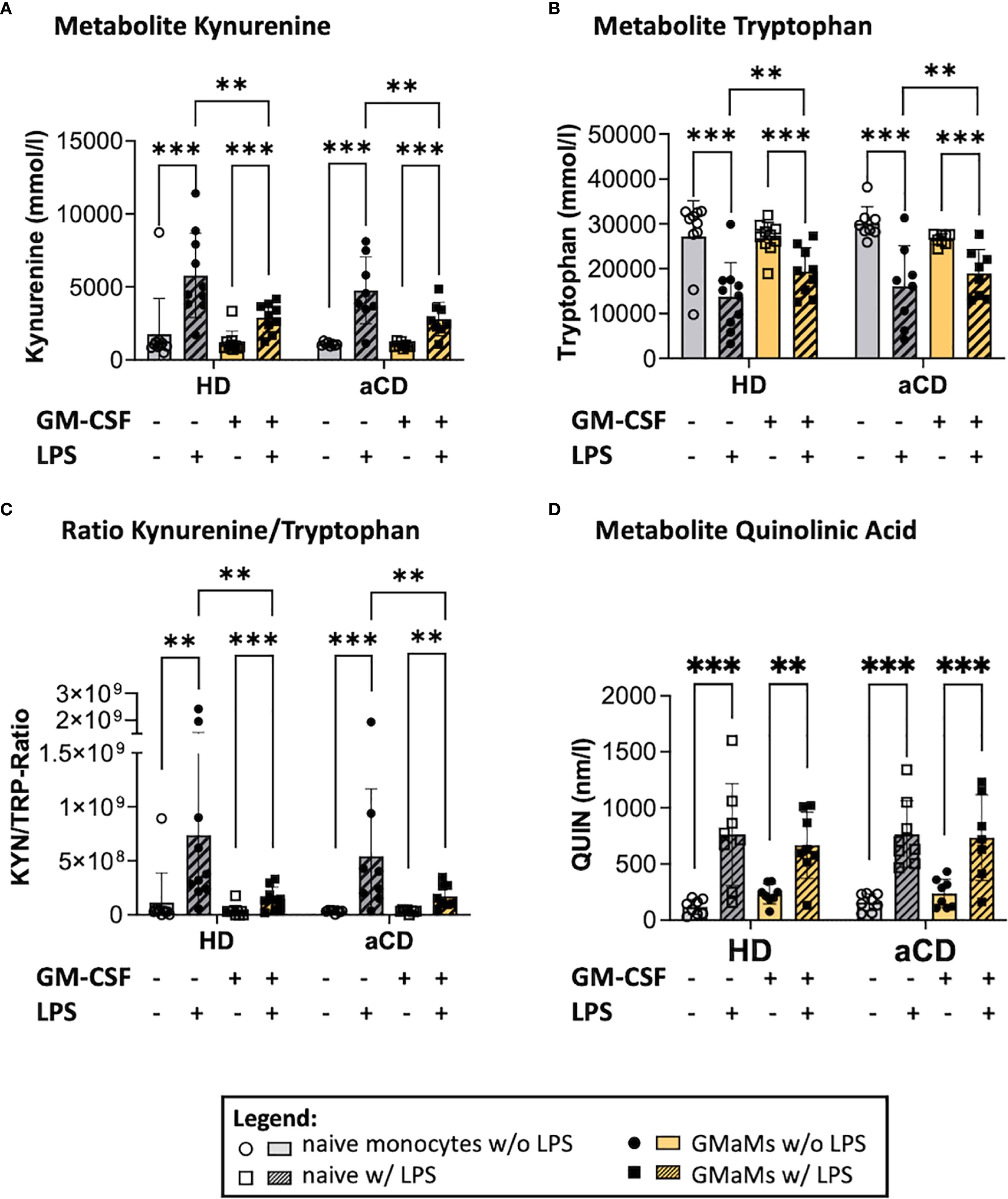 Figure 8. Metabolites and metabolic activity of GMaMs and naïve cells after incubation with or without LPS for 24h. Metabolites Kynurenin (A), Tryptophan (B), the Kynurenin/Tryptophan Ratio (C) as well as Quinolinic acid after 24h culture (D). (A-D) n(HD) = 8, n(aCD) = 8; **p < 0.01, ***p < 0.001. aCD, active Crohn’s disease; GM-CSF, granulocyte-macrophage colony-stimulating factor; HD, healthy donors; KYN, Kynurenin; LPS, lipopolysaccharides; QUIN, quinolinic acid; SD, standard deviation; TRP, Tryptophan.