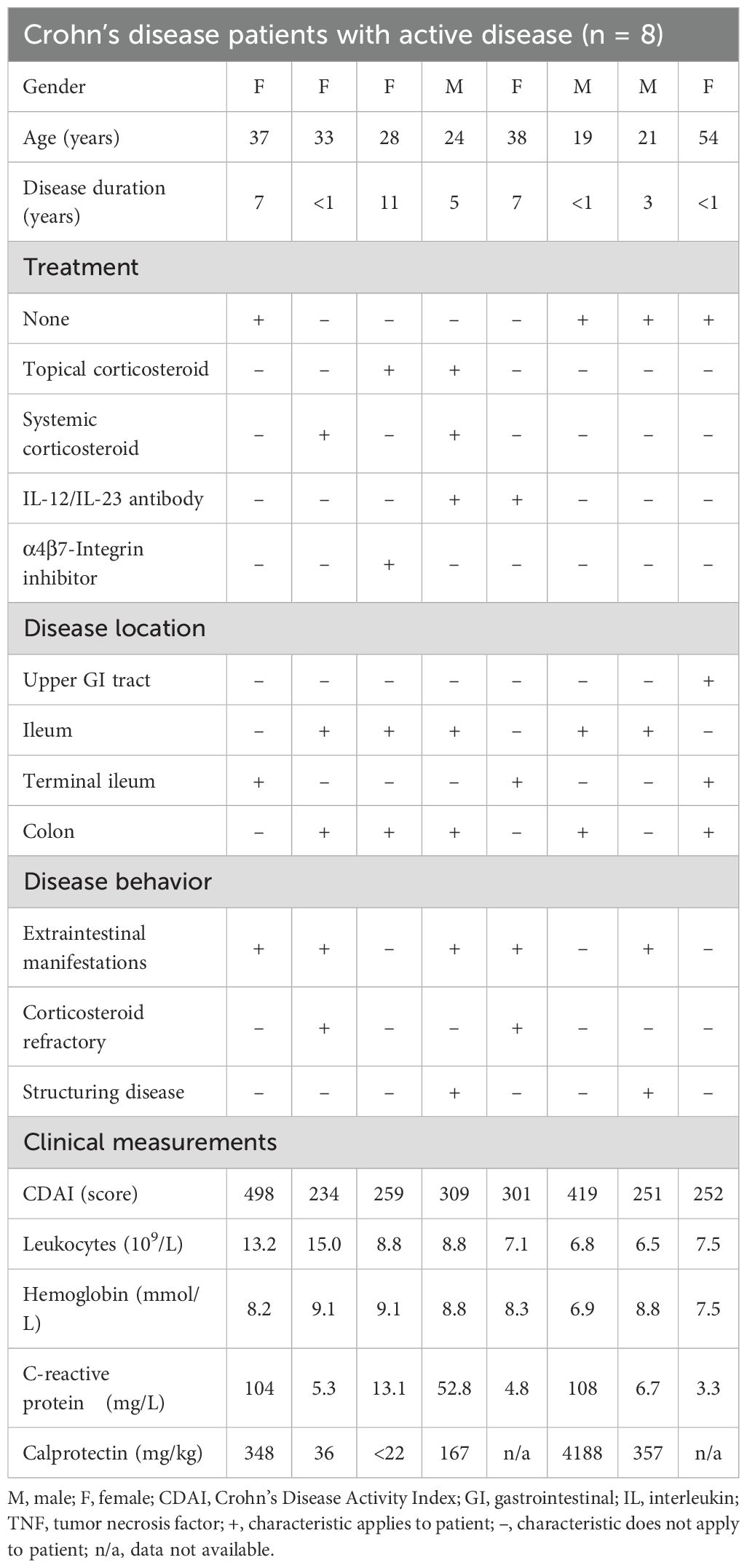 Crohn’s disease (CD) is a chronic relapsing inflammatory bowel disease (IBD), primarily affecting the gastrointestinal tract, with potential extraintestinal manifestations (1). Due to its rising incidence, prevalence and its associated systemic symptoms, CD concerns an increasingly diverse group of clinicians (2). Current treatment includes the use of medication, dietary adjustments, and surgical procedures. However, these are not curative (3). Medications in IBD are designed to systemically suppress the immune system using immunosuppressants (e.g., corticosteroids), immunomodulators (e.g., thiopurines), biologics (e.g., anti-tumor necrosis factor alpha, TNF-α) and/or small molecule drugs (e.g., Janus kinase inhibitors), all of which have potential systemic side effects such as an increased risk of infection and the development of malignancies (4). In addition, roughly 30% of patients fail to respond to anti-TNF-α treatment after one year and 60 to 70% after 3 years of treatment (5), requiring the development of new approaches to the treatment and monitoring of IBD.