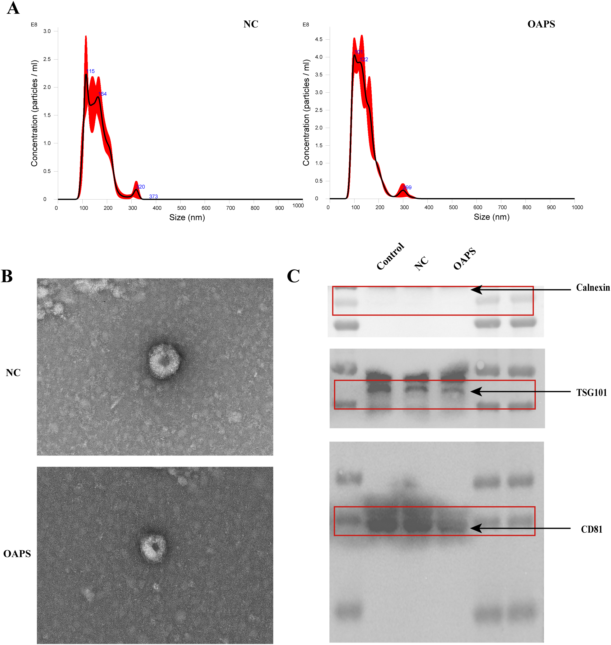 The average peak size of exosomes from control and OAPS blood samples was 159.8 ± 2.8 nm and 140.3 ± 0.4 nm, respectively (Figure 2A), consistent with the known size range of exosomes. TEM showed that the extracted substance was nearly round or cup-shaped with an approximate diameter of 100 nm (Figure 2B). Western blot analysis confirmed the presence of exosome-specific markers CD81 and TSG101, while the endoplasmic reticulum marker calnexin, used as a negative control, was absent (Figure 2C).