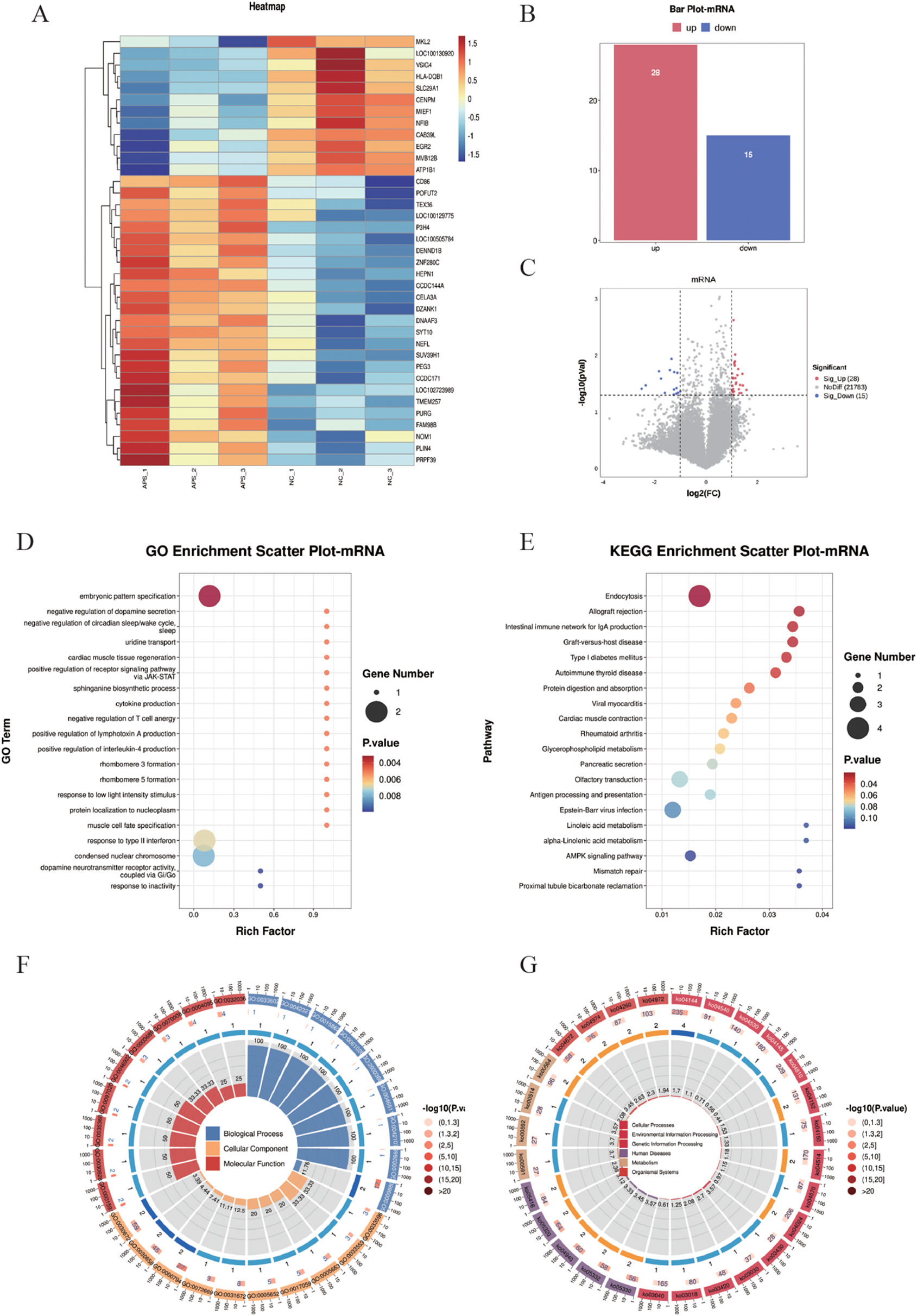 DE-mRNA screening and functional enrichment analysis between OAPS and NC group. (A) Heatmap. (B) Bar plot of DE-mRNAs statistics. The x-axis represents groups, and the y-axis indicates the number of differentially expressed genes (DEGs) in each group. (C) Volcano plot of DE-mRNAs. The x-axis corresponds to log2FoldChange, and the y-axis represents −log10(p-value). (D) GO enrichment analysis of DE-mRNAs. The y-axis displays GO term names, and the x-axis shows the number of enriched genes. (E) KEGG enrichment analysis of DE-mRNAs. The y-axis displays KEGG term names, and the x-axis shows the number of enriched genes. (F, G). Loop diagrams illustrating GO enrichment analysis (F) and KEGG enrichment analysis (G) of DE-mRNAs.