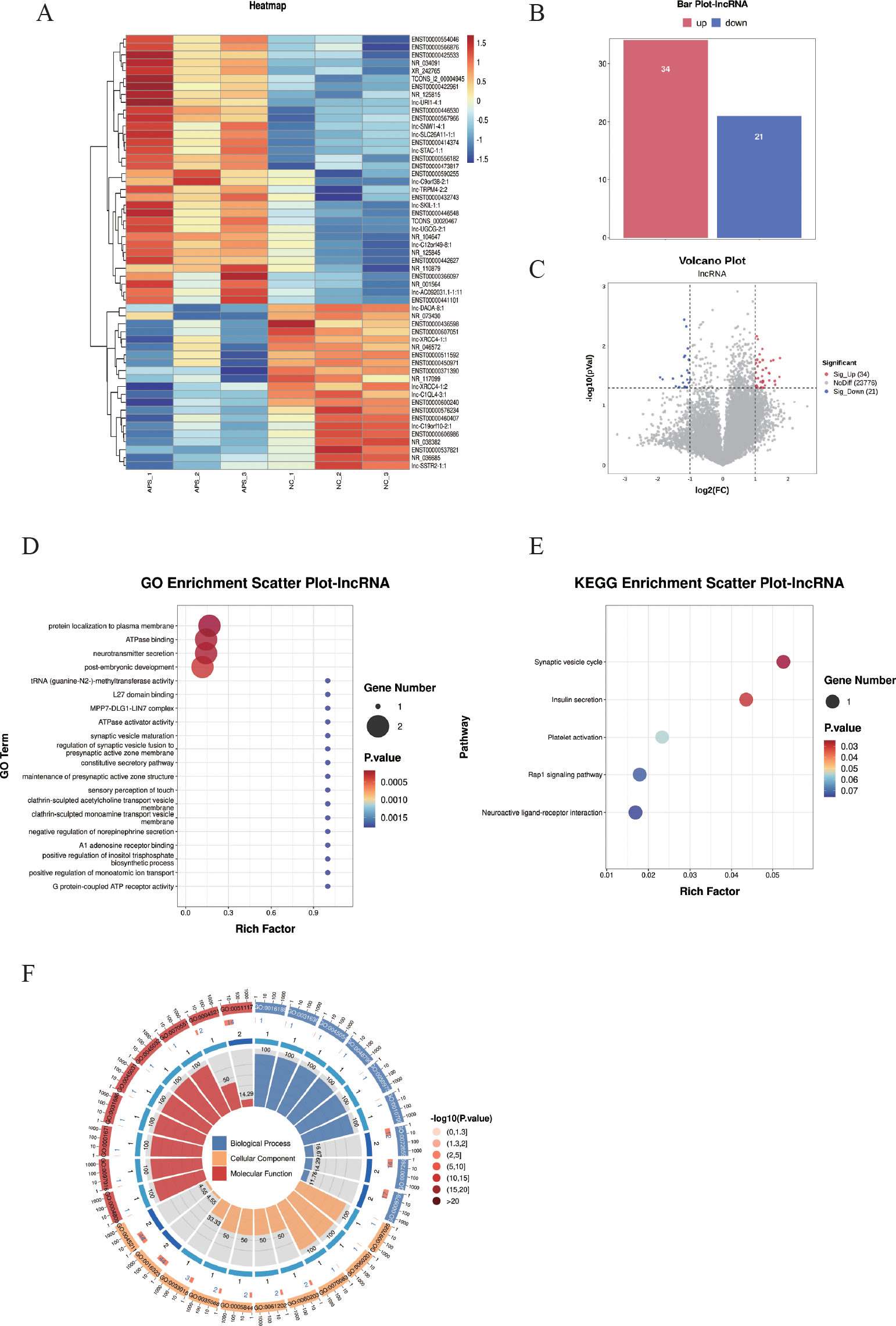DE-lncRNA screening and functional enrichment analysis between OAPS and NC group. (A) Heatmap. (B) Bar plot of DE-lncRNAs statistics. The x-axis represents groups, and the y-axis indicates the number of differentially expressed DE-lncRNAs in each group. (C) Volcano plot of differentially expressed lncRNAs, the x-axis corresponds to log2FoldChange, and the y-axis represents −log10(p-value). (D) GO enrichment analysis of differentially expressed lncRNAs. (E) KEGG pathway enrichment analysis of differentially expressed lncRNAs. (F) Loop diagrams showing classification of enriched GO terms under biological process, cellular component, and molecular function categories; outer ring labels GO terms, and color intensity represents enrichment significance -log10(p-value).