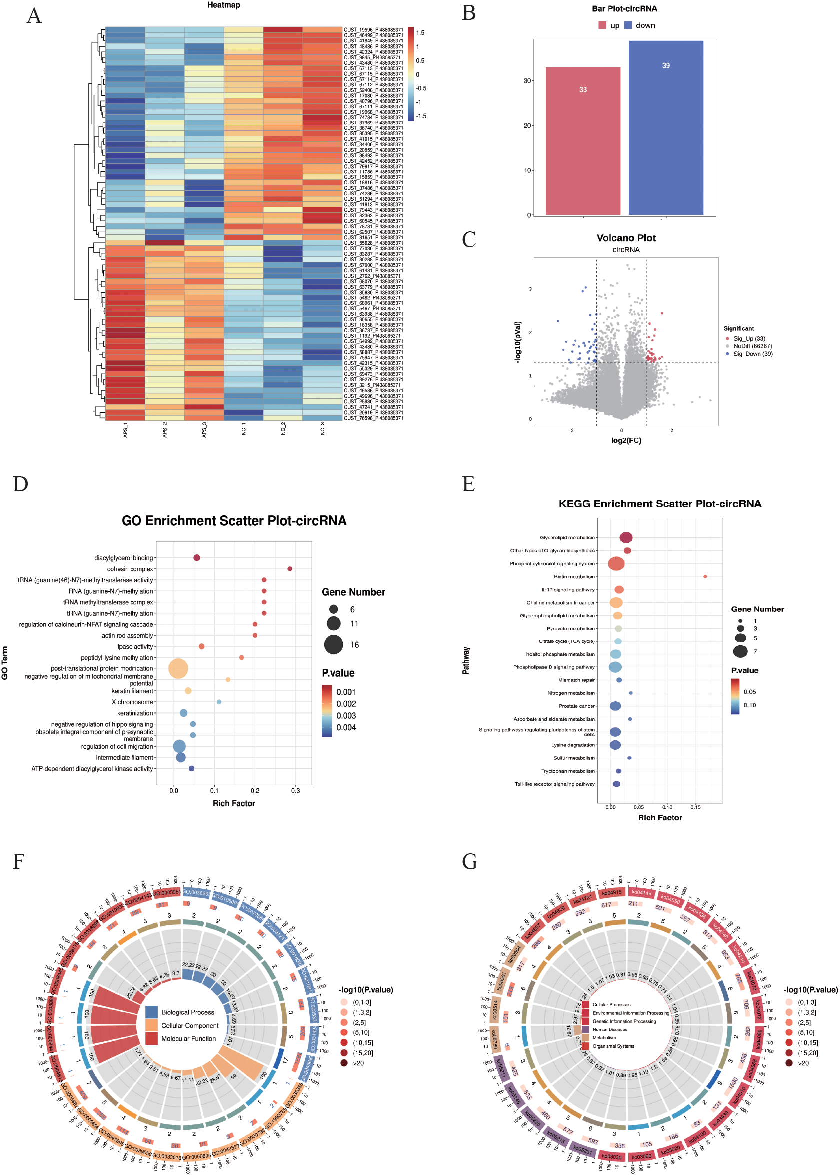 DE-circRNA screening and functional enrichment analysis between OAPS and NC group. (A) Heatmap. (B) Bar plot of DE-circRNAs statistics. The x-axis represents groups, and the y-axis indicates the number of DE-circRNAs in each group. (C) Volcano plot of DE-circRNAs. The x-axis corresponds to log2FoldChange, and the y-axis represents −log10(p-value). (D) GO enrichment analysis of DE-circRNAs. The y-axis displays GO term names, and the x-axis shows the number of enriched genes. (E) KEGG enrichment analysis of DE-circRNAs. The y-axis displays KEGG term names, and the x-axis shows the number of enriched genes. (F, G) Loop diagrams illustrating GO enrichment analysis (F) and KEGG enrichment analysis (G) of DE-circRNAs.