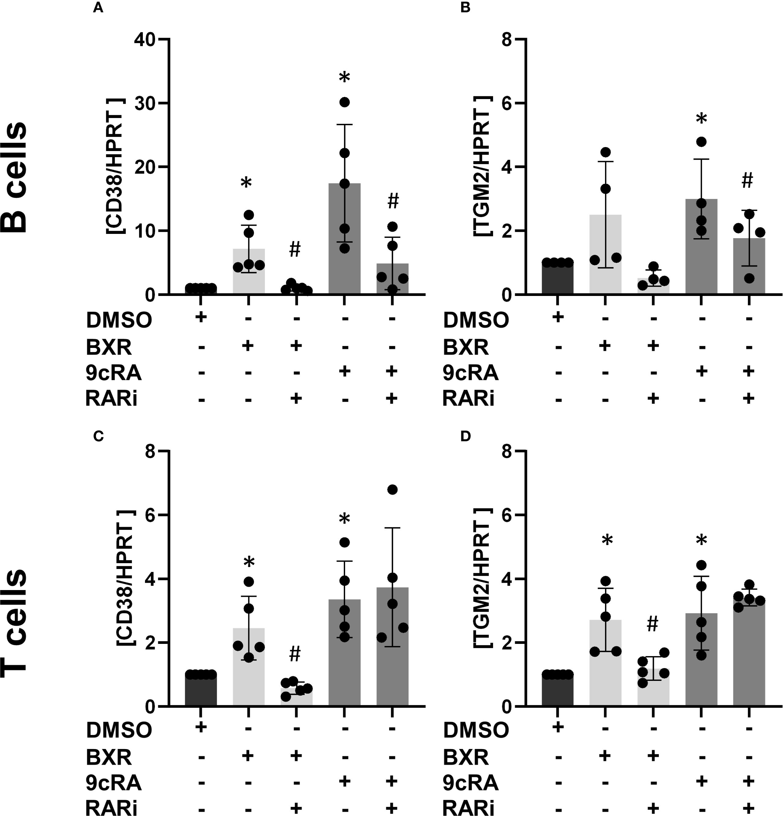 Figure 1. Bexarotene induces CD38 and TGM2 transcription. Isolated B cells (n = at least 4; (A, B) and T cells (n = 5; (C, D) were stimulated with BXR or 9cRA as well as a combination of 9cRA or BXR and RARi (all 1 µM) for 2 days. The transcription of the retinoid response genes CD38 (A, C) and TGM2 (B, D) was measured using qPCR. The data were normalized to HPRT and then to DMSO stimulation and analyzed using one-sample t-test (*p < 0.05) compared to DMSO control or the RARi combination with 9cRA or BXR by paired t-test compared to 9cRA or BXR stimulation, respectively (#p < 0.05). Each data point represents one healthy donor, and error bars indicate mean + SD. BXR, bexarotene; 9cRA, 9-cis-retinoic acid; RARi, retinoic acid receptor inhibitor AGN194310.
