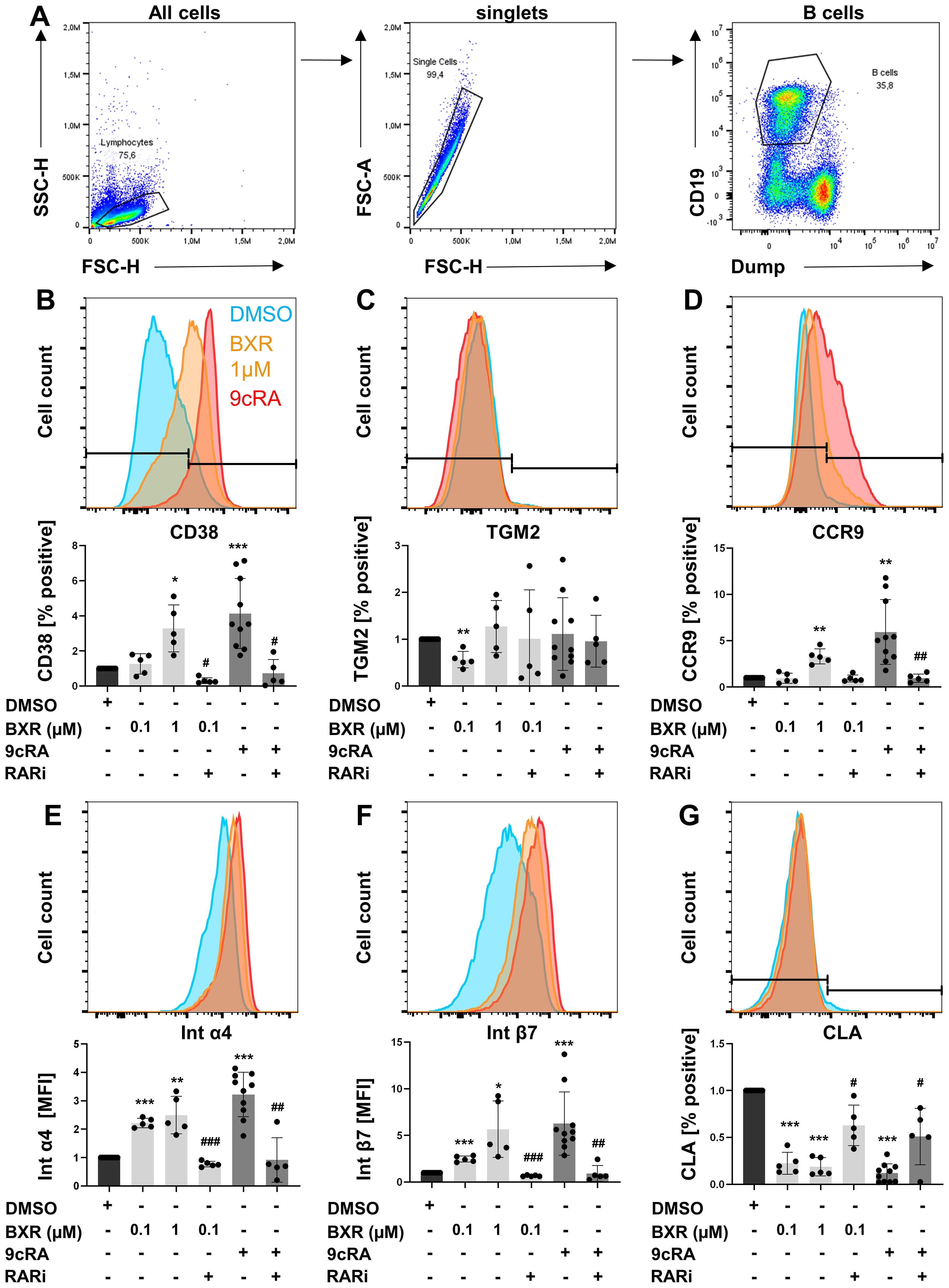 Figure 2. Increased gut-homing marker expression on B cells after retinoid stimulation. PBMCs (n = at least 5) were stimulated with CD40L, IL-21, IL-10, IL-4, and CpG 2006 in presence and absence of BXR (0.1 and 1 µM) or 9cRA (0.1 µM) with and without RARi (10 µM) for 4 days, and the expression of homing markers was analyzed. (A) Gating strategy of B cells. Histogram overlays of (B) CD38, (C) TGM2, (D) CCR9, (E) integrin α4, (F) integrin β7, and (G) CLA from a representative donor and respective bar diagrams of surface expression shown as percentage positive of B cells or MFI. The data were normalized to the DMSO control, tested for normality by Shapiro–Wilk test, and analyzed using one-sample t-test compared to DMSO stimulation (*p < 0.05. **p < 0.01, and ***p < 0.001) or the RARi combination with 9cRA or BXR analyzed using paired t-test (#p < 0.05, ##p < 0.01, and ###p < 0.001) compared to 9cRA or 0.1 µM BXR stimulation, respectively. Each data point represents one healthy donor, and error bars indicate mean + SD. PBMCs, peripheral blood mononuclear cells; BXR, bexarotene; RARi, retinoic acid receptor inhibitor AGN194310; CLA, cutaneous leucocyte-associated antigen; MFI, mean fluorescence intensity; DMSO, dimethyl sulfoxide; 9cRA, 9-cis-retinoic acid.
