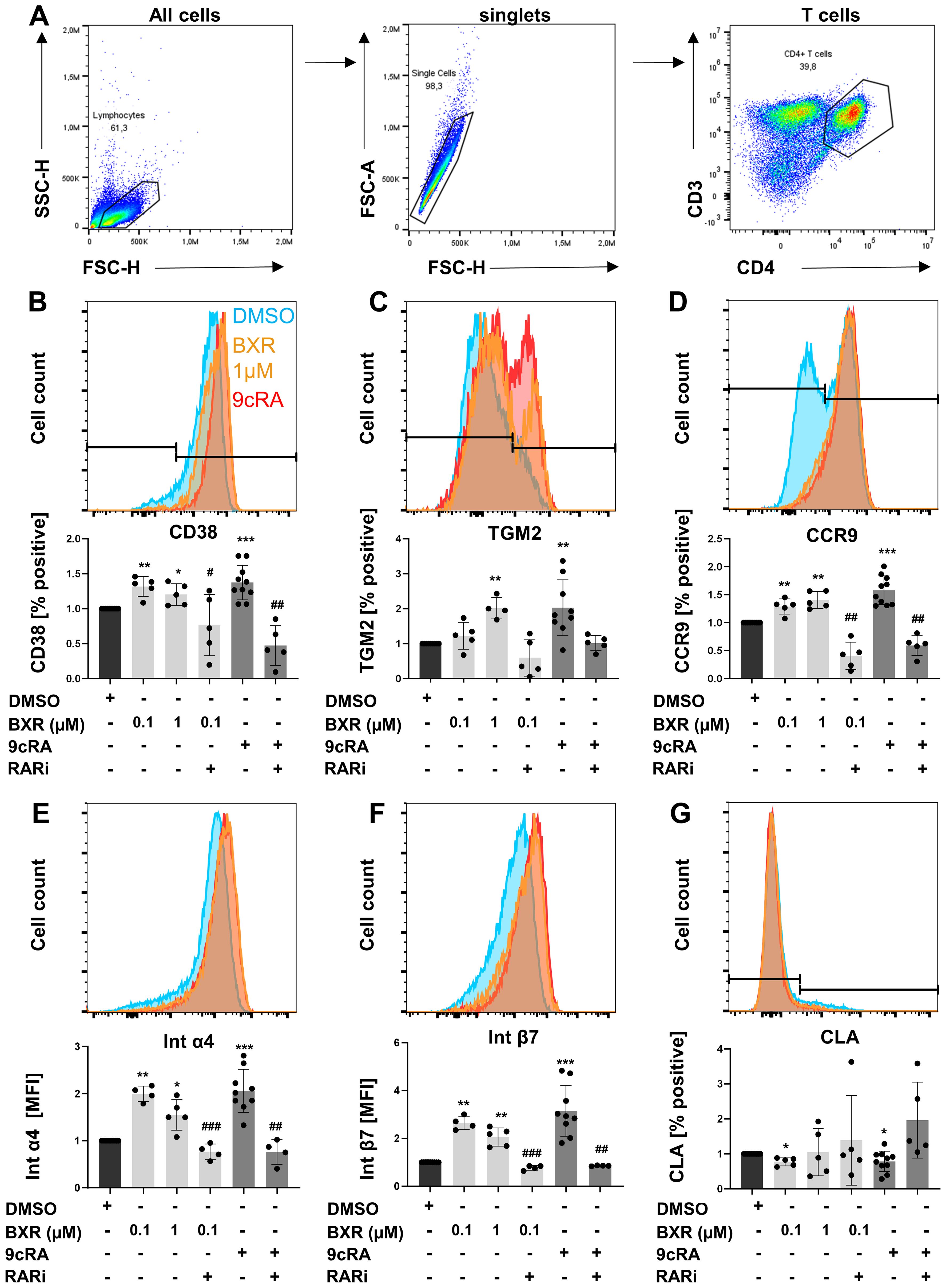 Figure 3. Increased gut-homing marker expression on T cells after retinoid stimulation. PBMCs (n = at least 5) were stimulated with anti-CD3 and anti-CD28 in presence and absence of BXR (0.1 µM and 1 µM) or 9cRA (0.1 µM) with and without RARi (10 µM) for 4 days, and the expression of homing markers was analyzed. Gating strategy of T cells (A). Histogram overlays of (B) CD38, (C) TGM2, (D) CCR9, (E) integrin α4, (F) integrin β7, and (G) CLA from a representative donor and respective bar diagrams of surface expression shown as percentage positive of B cells or MFI. The data were normalized to the DMSO control, tested for normality by Shapiro–Wilk test, and analyzed using one-sample t-test compared to DMSO stimulation (*p < 0.05, **p < 0.01, and ***p < 0.001) or the RARi combination with 9cRA or BXR analyzed using paired t-test (#p < 0.05, ##p < 0.01, and ###p < 0.001) compared to 9cRA or 0.1 µM BXR stimulation, respectively. Each data point represents one healthy donor, and error bars indicate mean + SD. PBMCs, peripheral blood mononuclear cells; BXR, bexarotene; 9cRA, 9-cis-retinoic acid; RARi, retinoic acid receptor inhibitor AGN194310; CLA, cutaneous leucocyte-associated antigen; MFI, mean fluorescence intensity; DMSO, dimethyl sulfoxide.