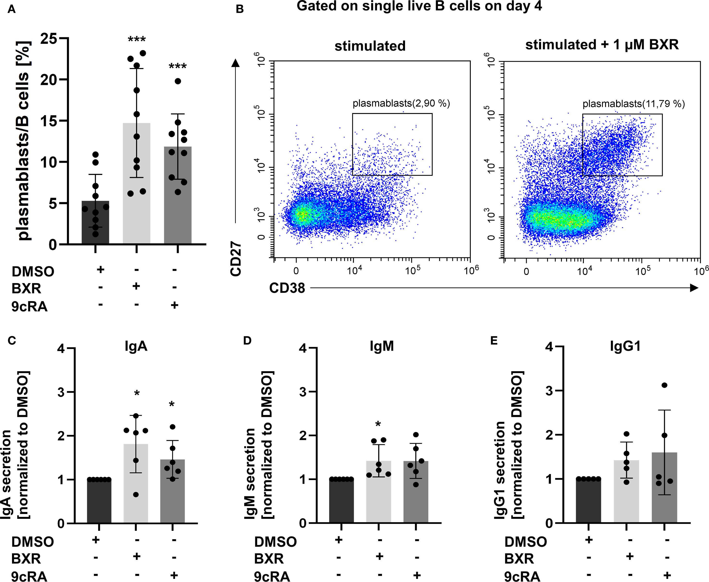 Figure 4. Bexarotene stimulation increases plasmablasts as well as IgA and IgM antibody secretion. PBMCs (n = at least 5) were stimulated with CD40L, IL-21, IL-10, IL-4, and CpG 2006 and BXR (1 µM) or 9cRA (0.1 µM) for 4 days. Gated on single live B cells. (A) Percentage of plasmablasts. (B) Representative plot of plasmablasts with BXR stimulation compared to DMSO control. The supernatant was analyzed for secreted antibodies of (C) IgA, (D) IgM, and (E) IgG1 isotypes. The data were normalized to DMSO and analyzed using one-sample t-test (*p < 0.05, **p < 0.01, and ***p < 0.001) compared to DMSO control. Each data point represents one healthy donor, and error bars indicate mean + SD. PBMCs, peripheral blood mononuclear cells; BXR, bexarotene; 9cRA, 9-cis-retinoic acid; DMSO, dimethyl sulfoxide.