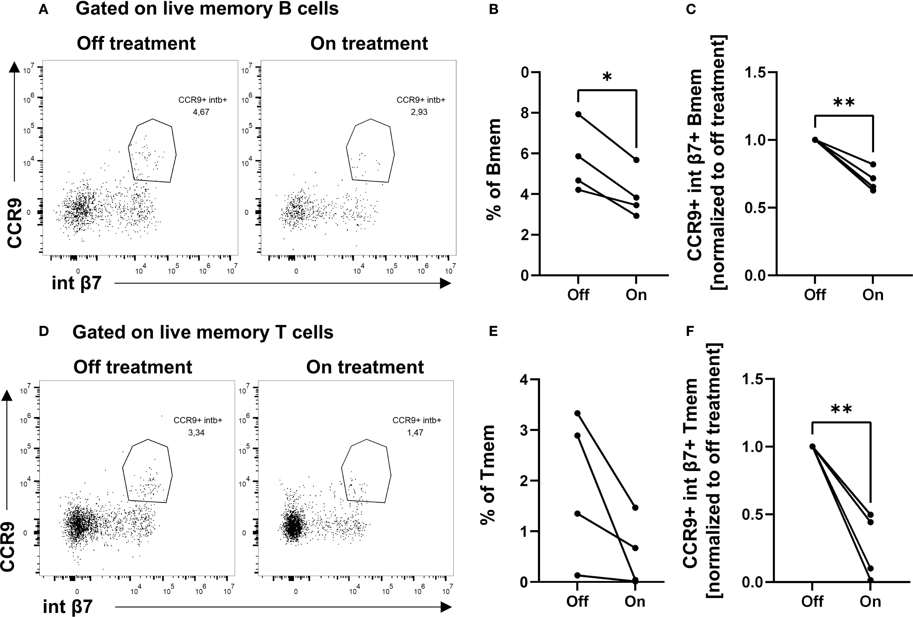 Figure 5. Decreased percentages of CCR9+ integrin β7+ double-positive memory B cells and memory T cells in patients on BXR treatment. PBMCs from cutaneous T-cell lymphoma patients (n = 4) on and off bexarotene (BXR) treatment were stained for the gut-homing markers CCR9 and integrin β7 (int β7). (A, D) The percentage of CCR9+ integrin β7+ memory B cells (Bmem) and memory T cells (Tmem) is shown as representative figures from one patient, as well as (B) the percentage of double-positive cells of memory B cells and (E) memory T cells, and (C, F) normalized to baseline values for each patient. PBMCs, peripheral blood mononuclear cells.