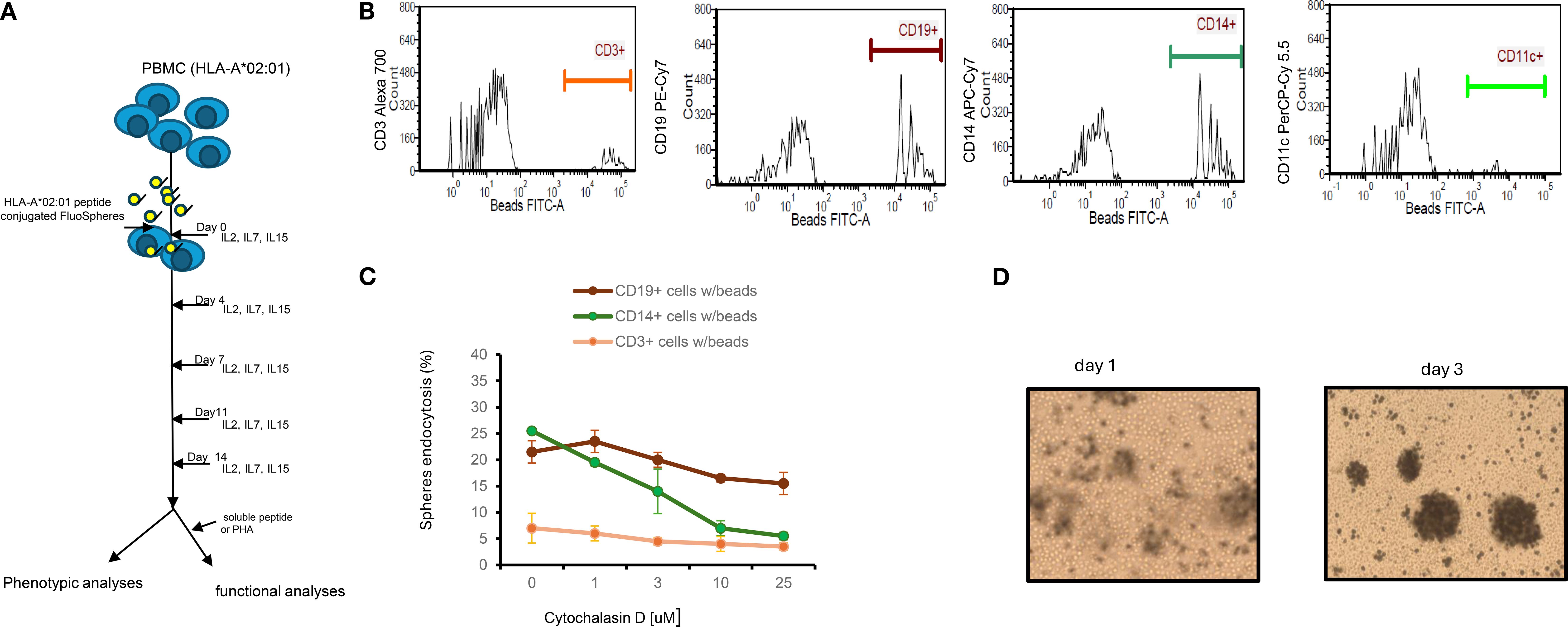 Figure 1. Experimental design, mechanism of endocytosis and cytokine dependent growth of lymphocyte. (A) Experimental design: Thawed PBMCs (1-3x106) carrying HLA*02:01 genotype were cultured with peptide conjugated spheres (either yellow-green (365/415) nm or blue (505/515) at a ratio of 1:100 ratio in the presence of IL2/IL7/IL15 for 14 days. Half of the culture medium was replaced every 4 days. Cells were analyzed for the appearance of tetramer+ or surface markers; in some experiments, cell cultured supernatants were also collected for other assays such as IFN-γ release. (B) Endocytosis of FluoSpheres by cells from PBMCs. Thawed PBMCs (n=3) were cultured with yellow-green (detected in FITC channel) Spheres in the same culture medium as described for 1, 4 and 12 hours. Cells were then washed extensively and counter-stained with CD3, CD14, CD19 and CD11c mAbs prior to analyses by Flow Cytometry. A representative result of cells from one PBMCs after 1 h of co-culture was shown. (C) Inhibition of endocytosis of FluoSpheres by cytochalasin D in monocytes is dose dependent. The results are for one-hour treatment, which includes 30 min of pre-treatment and 30 min of treatment with cytochalasin D, are Mean ± S.D. of two experiments. (D) Snapshot (100X) of cells/beads co-cultures. PBMC cells at 1x106 and beads at 1x108 were co-cultured in a 48-well-plate containing 1ml medium supplemented with IL2/IL7/IL15. Photos were taken on day 1 and day 3. .
