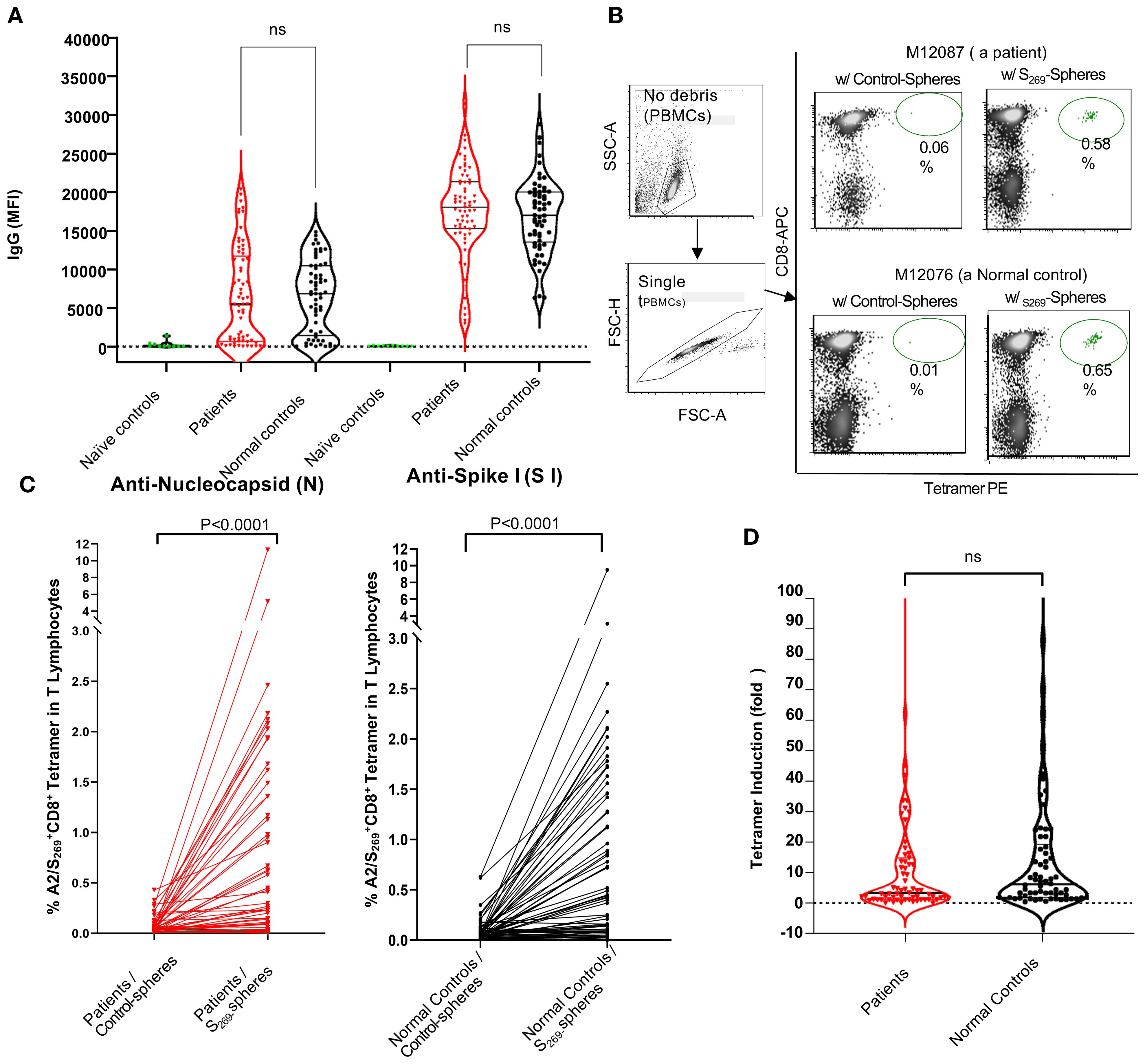 Figure 2. Analyses of anti-SARS-CoV-2 humoral and cellular responses in normal controls and kidney patients. (A) Violin Plot to show the levels of anti-SARS-CoV-2 IgG (anti-nucleocapsid and anti-S1) in individuals of naïve controls (n=11), normal control (n=66) and kidney patient individuals (n=67). Note that Naïve controls were designated as individuals whose sera were collected prior to or during 2020 with confirmation negative for COVID-19 tests done on nasal swabs. NS, no significance. B and C: Induction of A2/S269+CD8+ T subset cells in PBMCs by in vitro stimulation with either control-(no peptide) spheres or SARS-CoV-2S269--peptide conjugated spheres in normal controls and kidney patients. Representative results from one patient (M12087) and one normal control (M12076) were shown in (B) Compiling results from data of all subjects from both cohorts were shown in (C) Statistics of results were calculated by Mann-Whitney U (two-tailed) test. p < 0.05 was considered statistically significant. (D) Violin Plot to show no significant difference in induction of A2/S269+ CD8+T cell subsets between normal controls and patients. Tetramer induction was presented as folds (frequency of tetramer+ with peptide conjugated spheres/ frequency of tetramer+ with control-spheres). The p value returned by Mann-Whitney U (two-tailed) test was 0.3280. N.S, no significance.